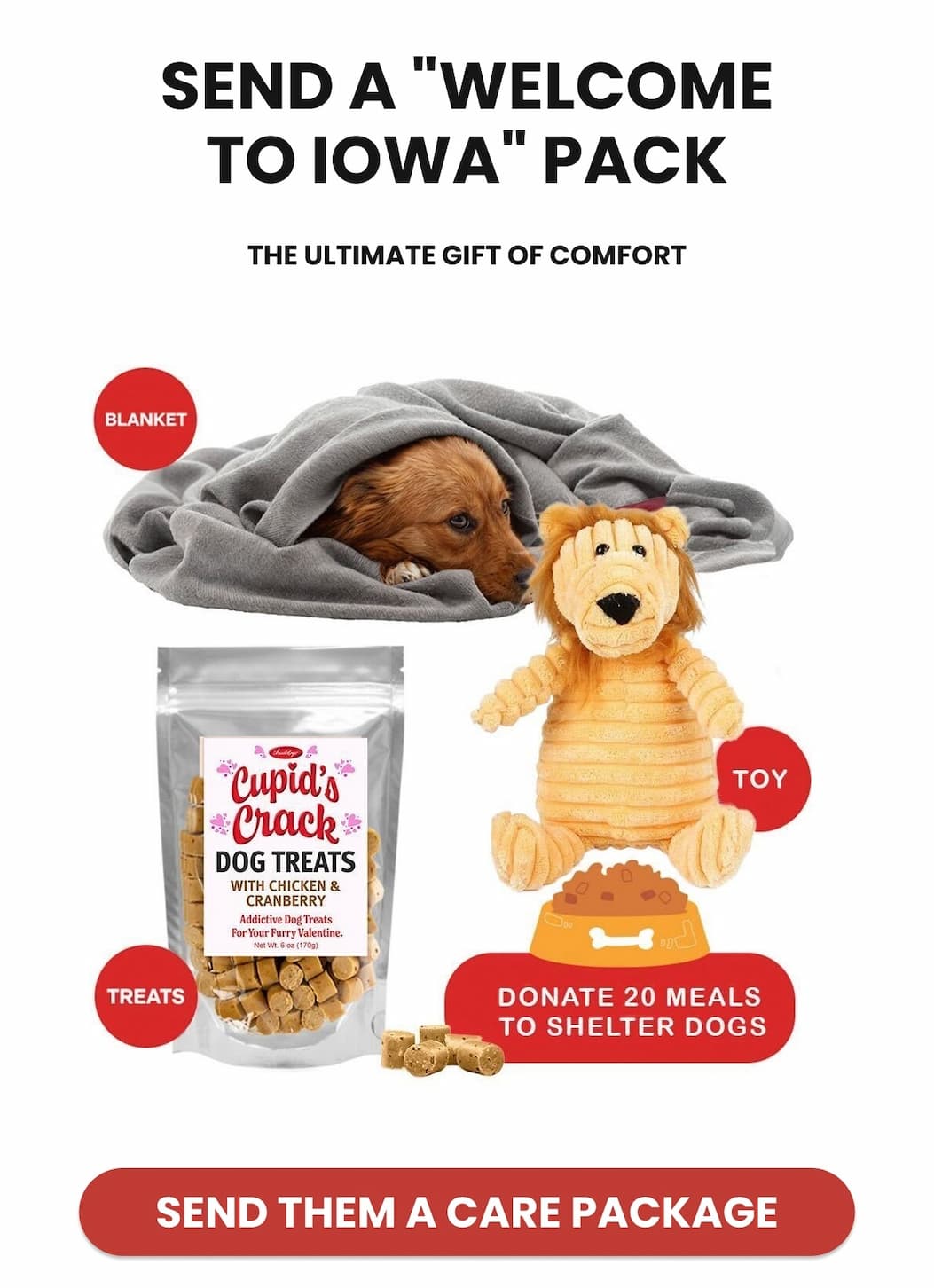 2.) Send a Care Package: Make sure they arrive with a blanket, a toy, 20 meals, and treats.