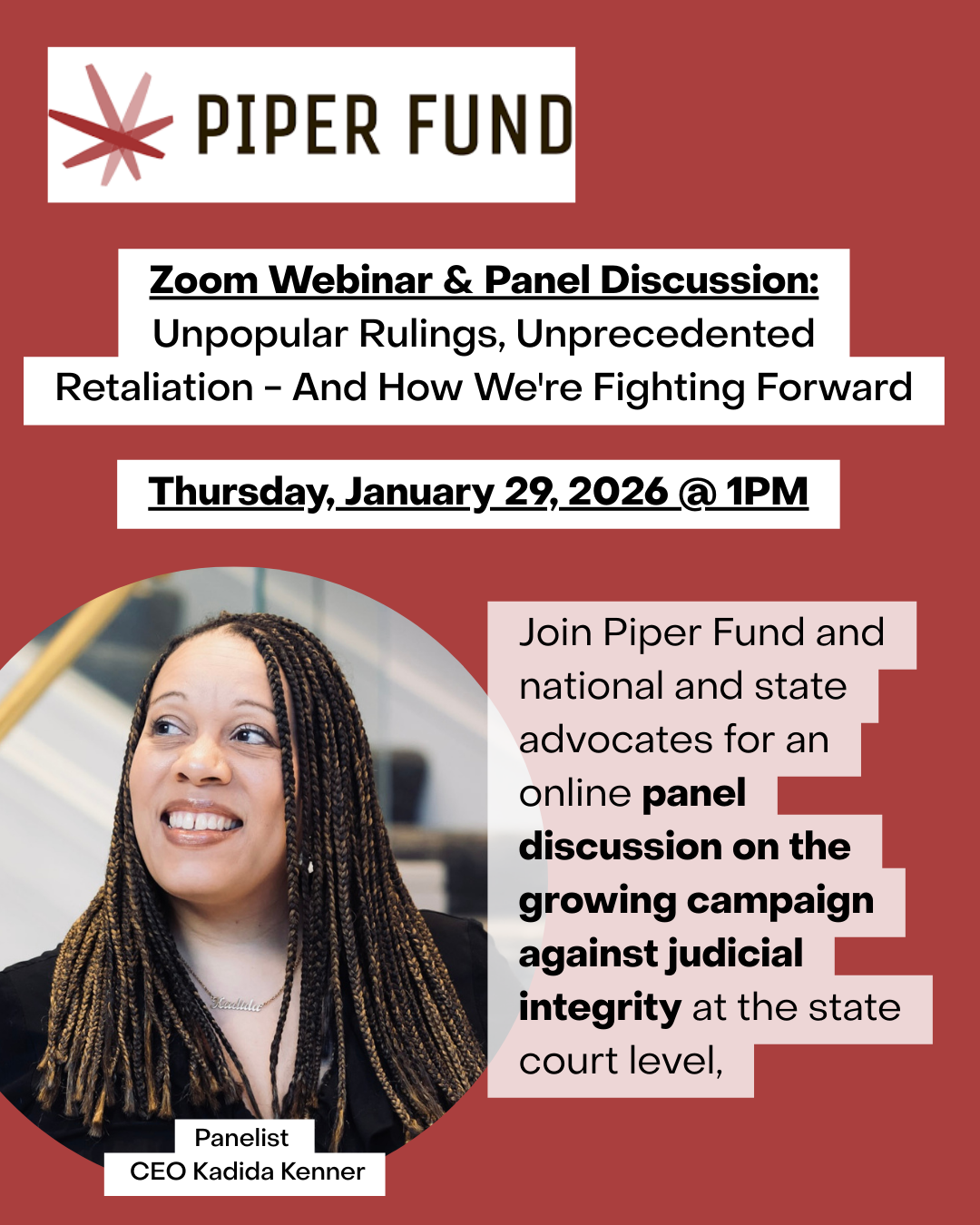 Join Piper Fund and national and state advocates, including founding CEO Kadida Kenner, for an online panel discussion on the growing campaign against judicial integrity at the state court level, why state courts matter, and what can be done to protect and advance judicial integrity. |