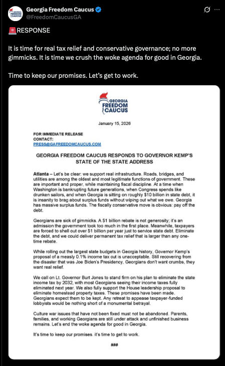 At the very start of session, our members publicly lay out their legislative priorities — and respond immediately to governors’ "State of the State" addresses, warning voters about the bad ideas being proposed before they’re buried in process or spin. Instead of letting leadership control the narrative, Freedom Caucuses force the Swamp to defend its agenda in the open. That’s exactly what we’re seeing now. In Missouri, South Dakota, Arizona, and elsewhere, Freedom Caucus members released focused agendas centered on fiscal restraint, election integrity, energy independence, and restoring constitutional limits. The Georgia Freedom Caucus's response to Governor Kemp's "State of the State" address was simple: It's time for REAL tax relief, no more gimmicks, and crushing the woke agenda. See below.