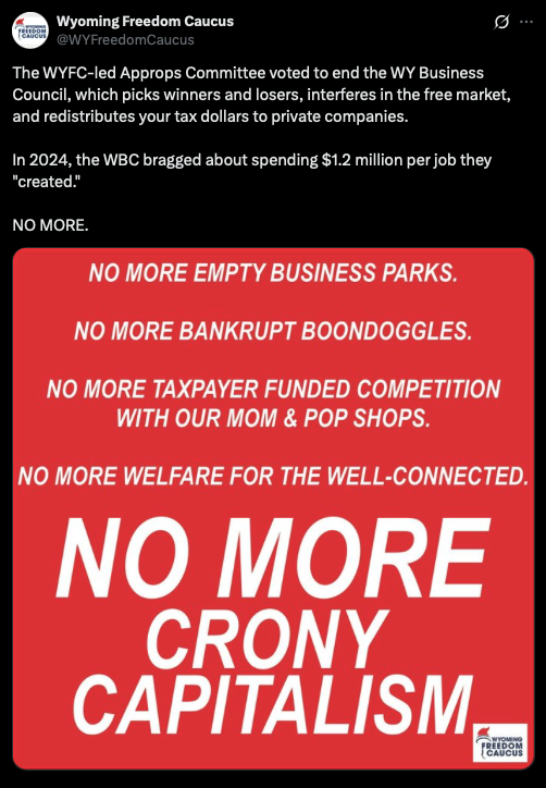 Shortly after, lawmakers also voted to eliminate the Wyoming Business Council, which is merely a slush fund for corporate welfare. This is a loud signal that taxpayer-funded favors for politically-connected interests are no longer business as usual. These votes are not the end of the process — but they are the opening shots in a battle against the Cheyenne Swamp.