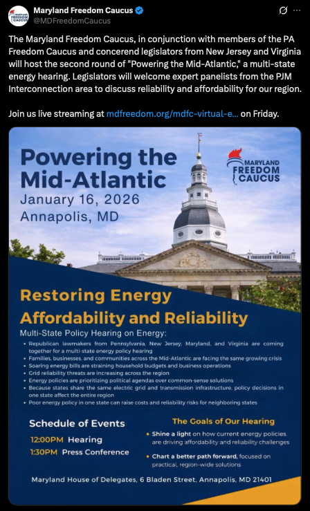 This week also marked an important evolution for the movement in two of our eastern states. The Maryland Freedom Caucus and Pennsylvania Freedom Caucus publicly coordinated on energy policy by sharing strategy, amplifying one another’s work, and pushing back against mandates that drive up costs for families and businesses.