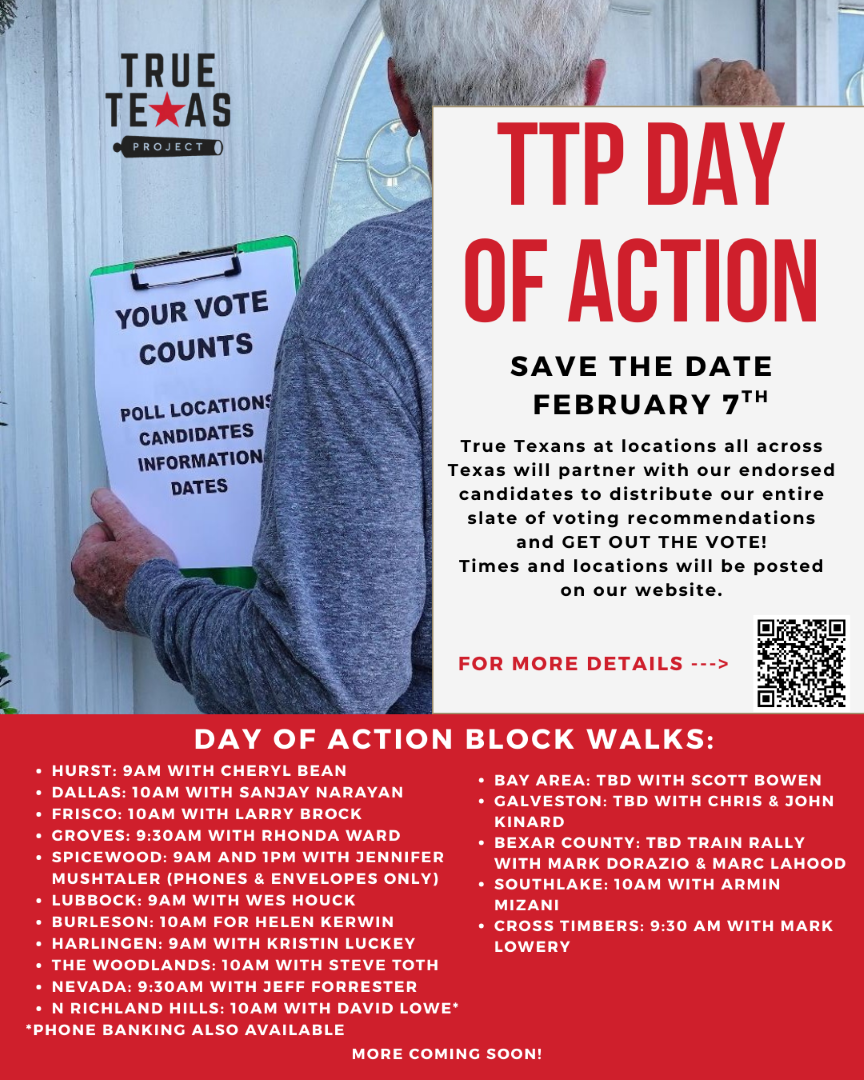 True Texas Project has a reputation for ACTION, and this is one of the biggest days of the year! On Feb 7, patriots across the state will be out pushing our TTP slate of candidates by blockwalking, phone banking, and stuffing envelopes. One area is even having a parade! To accomplish this, we're partnering with local candidates, so find an event near you and get involved with friends, old and new! The list below is always growing, so check our website for details.