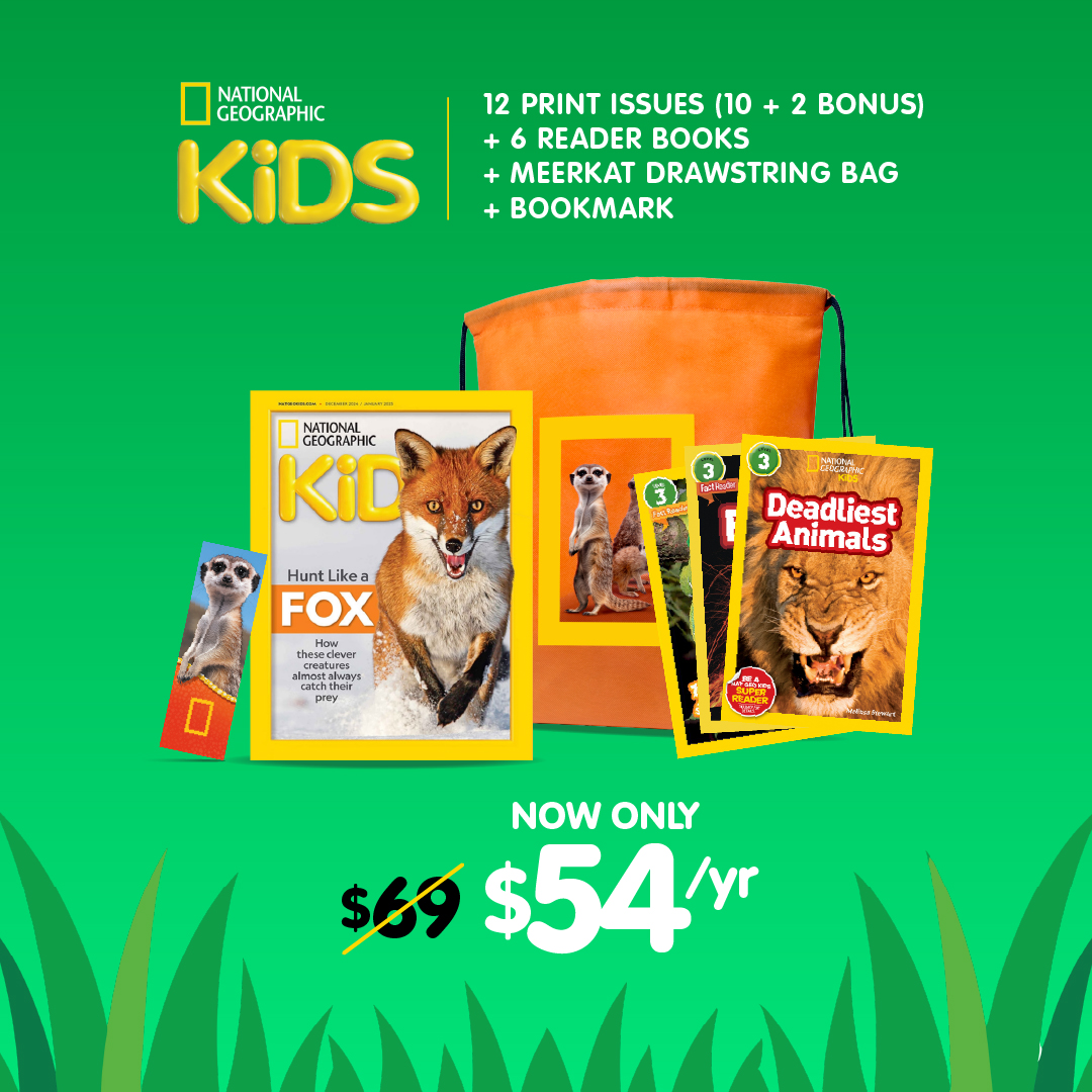 Your gift includes: • Nat Geo Kids magazine annual subscription • Six Level 3 Nat Geo Kids Reader Books • PLUS: 2 bonus issues Two FREE bonus gifts: • Meerkat Drawstring Bag • Meerkat Bookmark |