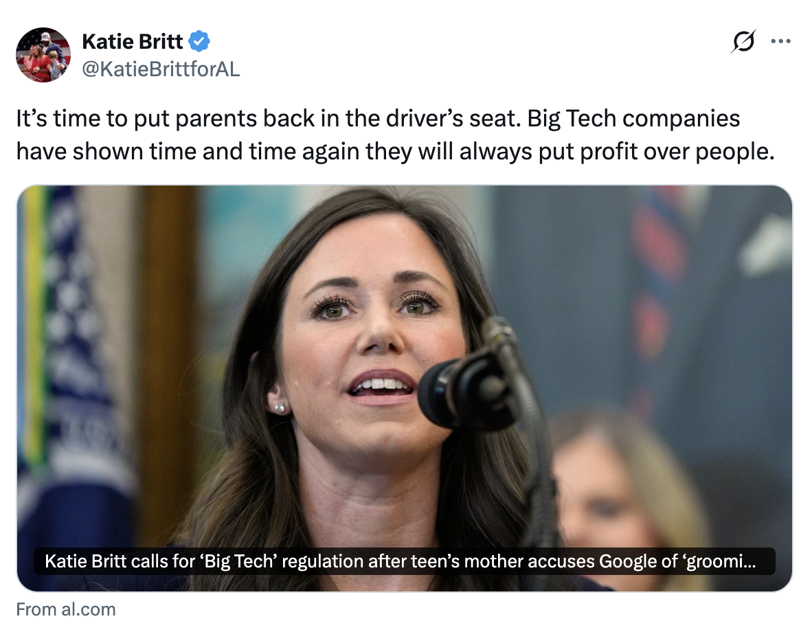 Alabama U.S. Sen. Katie Britt on Tuesday called for legislation to regulate how children interact with technology in response to a social media post.