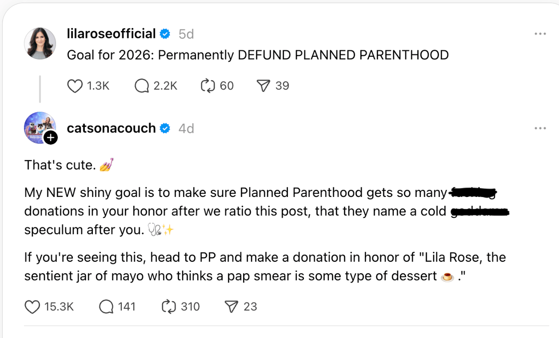 So far, this pro-abortion woman on X has facilitated the donation of tens of thousands of dollars to abortion giant Planned Parenthood. But let’s remember that we were successful in stripping hundreds of millions of dollars from Planned Parenthood by defunding it for just one year.