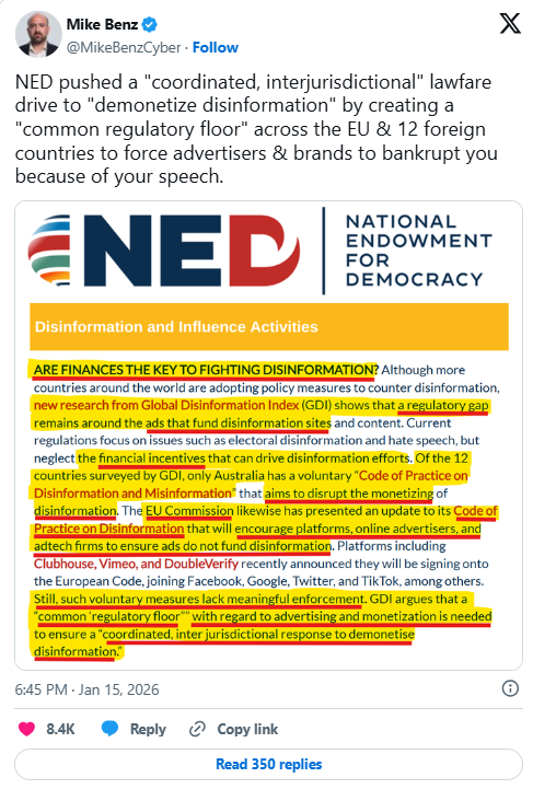 The National Endowment for Democracy (NED) was created under President Reagan as a bipartisan nonprofit to promote democracy overseas, funded entirely by Congress. In recent years, it has claimed to combat Russian and Chinese disinformation. In reality, NED has become a vehicle for left-wing propaganda, using taxpayer dollars to attack conservatives, demonize President Trump, and advance progressive ideology.