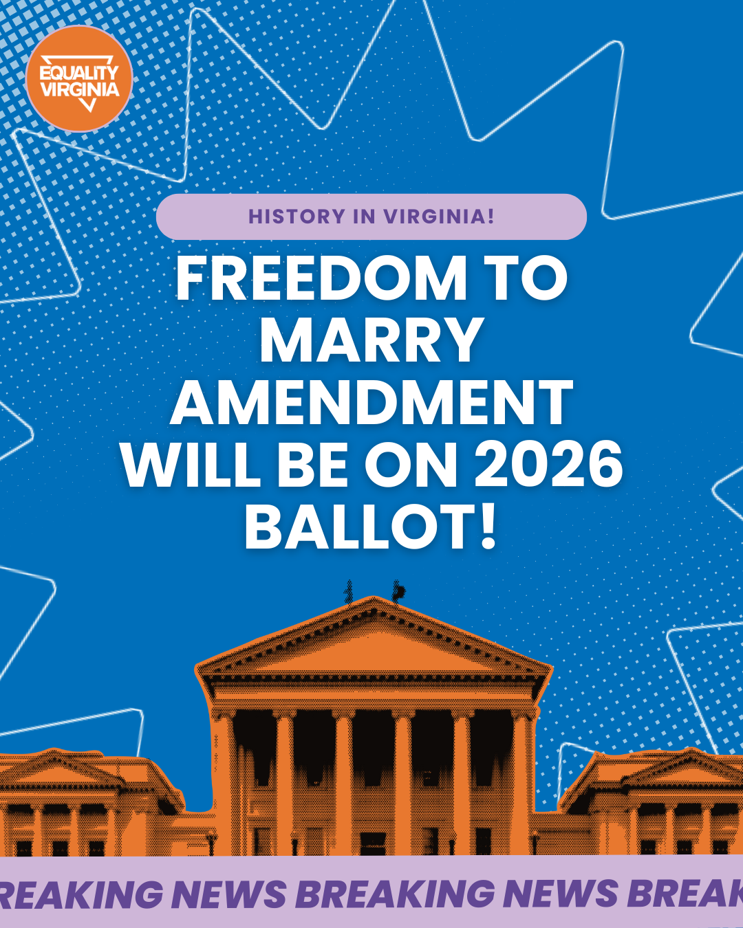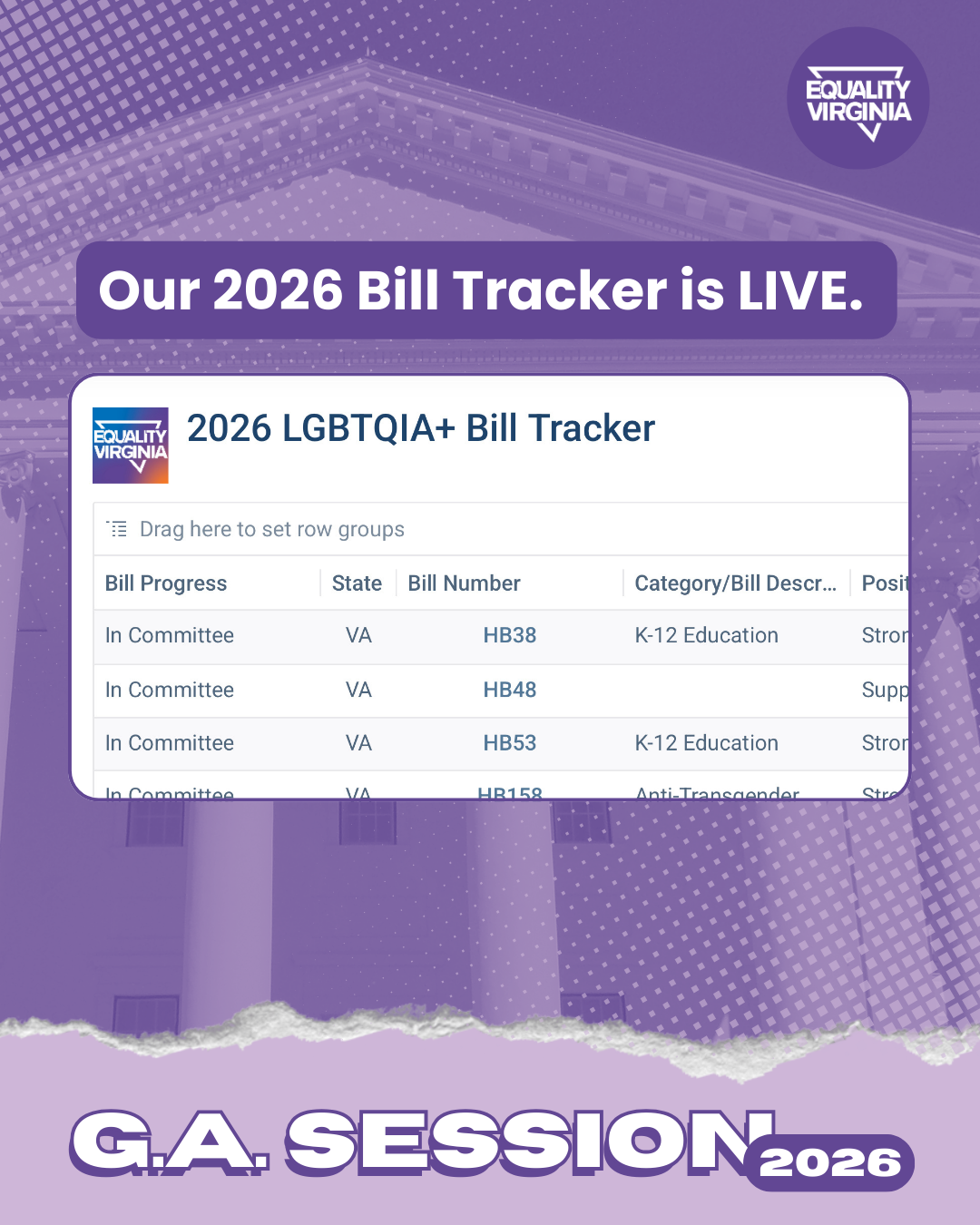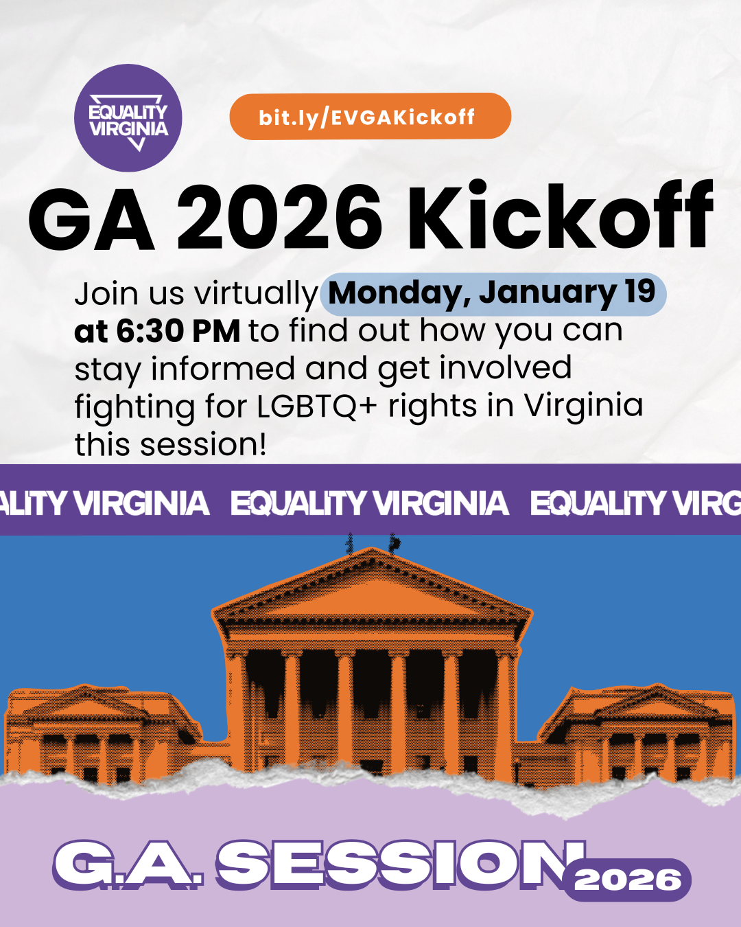 In this issue, we’re sharing how you can stay informed, get involved, and take action this session—including our upcoming GA Kickoff, LGBTQ+ Lobby Day, and what it means that the Freedom to Marry Amendment will be on the 2026 ballot. -- Equality Virginia Team |