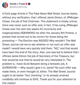 Lawsuit threat issued: Trump announced on Truth Social he will file suit against JPMorgan in coming weeks for alleged post-January 6 debanking, calling the January 6 protest “correct.”