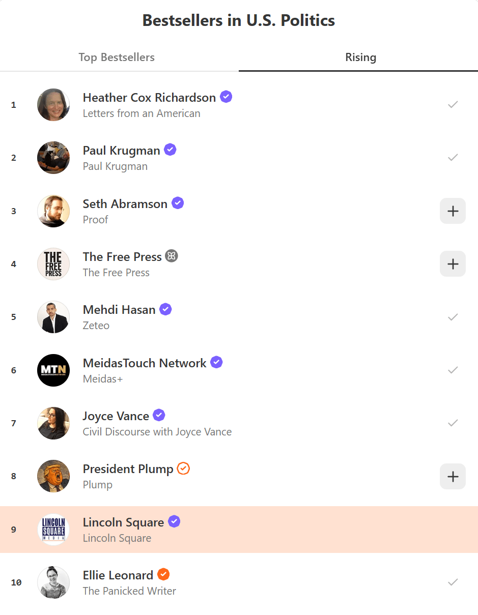 Dear Friend, THANK YOU for being such an active part of our growing community! As a free subscriber, you’ve had access to unparalleled insights you simply won’t find anywhere else—insights and content crafted to inform, prepare, and empower you for the fight ahead. By subscribing, you’ve also helped Lincoln Square become one of the fastest-growing pro-democracy communities on Substack! Scroll down and take a look for yourself! Soon, much of our content will be exclusively for paid subscribers—our Lincoln Loyal. As an independent, reader-supported outlet, we rely on your investment to continue delivering the facts at a time when legacy media is failing us. Your paid subscription is more than access; it’s an investment in defending democracy by helping us build the digital infrastructure we need to counter the well-funded, right-wing MAGA media disinformation machine. We invite you to become a paid Lincoln Loyal member and unlock our lowest rate ever. Join by midnight tomorrow to get 40% off our annual plan, forever! That’s just $60/year or $6/month. For as little as 16 cents per day, your upgrade helps us amplify the facts across social media to disengaged Americans and bring you news and expert live and written commentary from strategists, contributors, and guests. Isn’t that worth it to you? that’s less than the price of a burger every month. You can cancel anytime—but you have to hurry! This expire ends in 24 hours. Take a look at some of our highlights since the start of the new year, brought to you by our paid subscribers and donors: