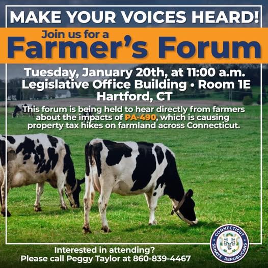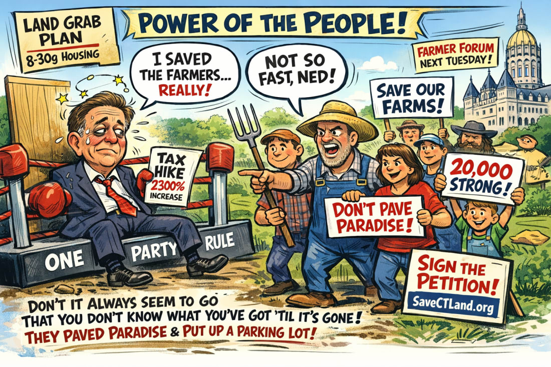 Goldstein For Congress - Please Subscribe and also visit us at www.goldsteinforcongress.com Connecticut Farmers Win a Critical First Battle — But the Fight Is Far From OverGet to Tuesday's Farmer Forum and Take Action NowWhile Most Nutmeggers enjoyed a Federal Holiday to honor the life of Martin Luther King Jr, a man who had a dream of Equality over bureaucratic “equity”, Governor Ned Lamont directed the Office of Policy and Management to revert the land use values for farms and open spaces to their 2020 Rates averting tax increases for some farmers over 2300% (See previous article) Let’s Be Clear - This Did Not Happen By ActionThis reversal by Lamont was no accident. It was prompted due to a petition circulated that reached over 20,000 petitions in just a few days in a grassroots uprising of farmers, landowners, residents and neighbors standing up for the injustice to their friends and neighbors. This is a beginning - It is Not a victory lap. IF YOU HAVE NOT SIGNED THE PETITION ? DO 3 ThingsStep 1 - View the Save CT petition and sign it today: https://www.savectland.orgStep 2 - Share the Save CT petition https://www.savectland.orgStep 3 - Subscribe to this Substack and Share it -What is Next? - A Farmer Forum at the Capitol Today (Tuesday - January 20) - Attend if You CanDo Not Let Ned and Hartford Rewrite the Grassroots NarrativeIt is really important that you stay on top of our elected officials, especially at the top of the ticket with Gov. Ned Lamont. He will likely claim he listened and saved the farmers while it was his party that arrived at another detrimental piece of legislation that would have paved the way for forced sales, commercial farms, and conversion of farmland to 8-30g or other “affordable” housing wastelands. Without sustained pressure, this pause becomes a pivot—and the bulldozers return. A Warning from History (and Music)If we let up now, Connecticut’s farmland future looks a lot like the warning sung decades ago by Big Yellow Taxi: don't it always seem to go Do Not Rest on Your Laurels while we have made an impact to put Lamont and the one-party rule on the ropes (at least for a moment. Again - 3 Steps to Take Action and be informed and keep on Pressing: Step 1 - View the Save CT petition and sign it today: https://www.savectland.org Step 2 - Share the Save CT petition https://www.savectland.org Step 3 - Subscribe to this Substack and Share it as it is informing many and can inform more - The People Still Have the Power if you exercise it.If you want to read the original article: The Goldstein Substack is free today. But if you enjoyed this post, you can tell The Goldstein Substack that their writing is valuable by pledging a future subscription. You won't be charged unless they enable payments. |