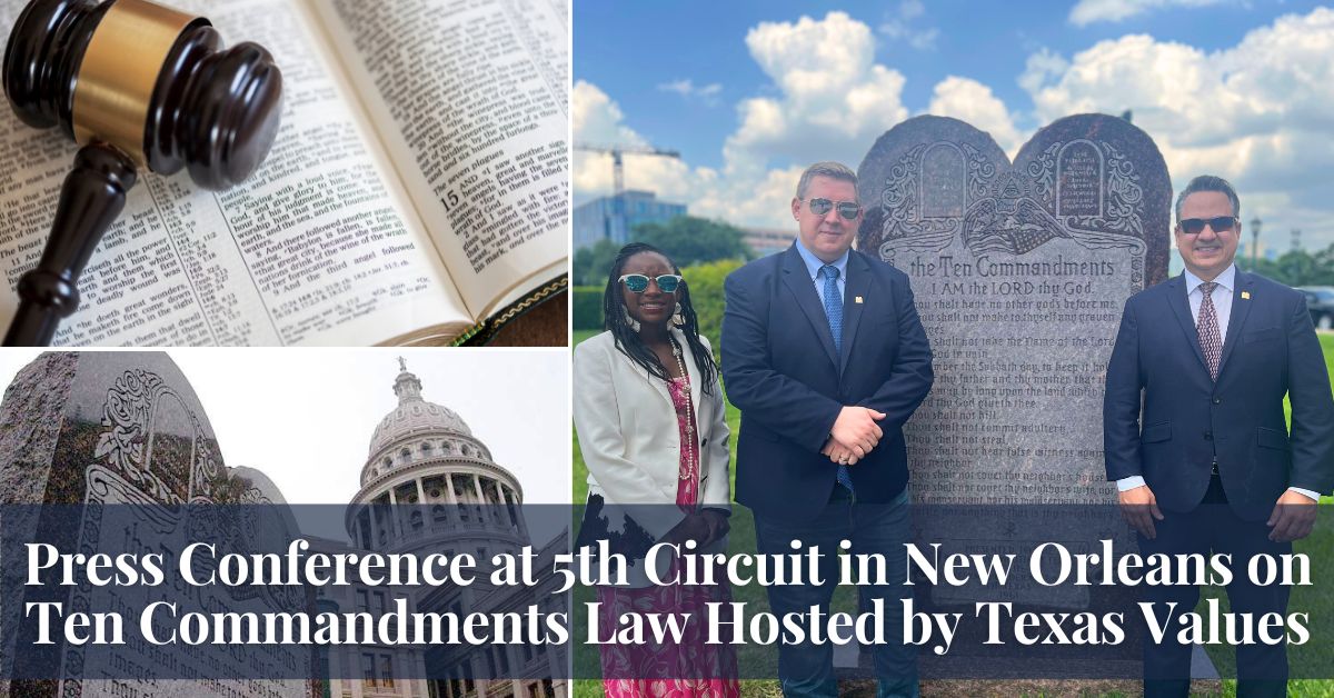 Today, Tue., January 19, Texas Values, together with Louisiana Family Forum, will hold a press conference in front of the Fifth Circuit Court of Appeals (John Minor Wisdom) Courthouse in New Orleans, Louisiana just before the start of oral arguments before the full court on the constitutionality of the Louisiana and Texas Ten Commandments laws. Louisiana's law, H.B. 71 was enacted in June 2024. and Texas' law, S.B. 10, became effective September 2025. The press conference begins TODAY at 11:30am in front of the courthouse. Watch LIVE on our Facebook page.