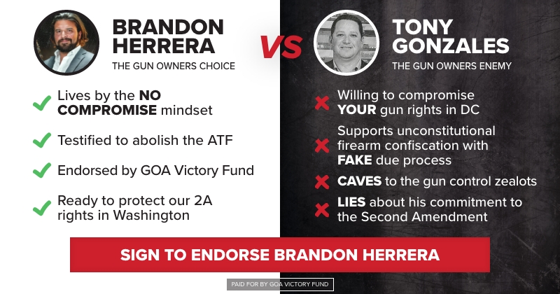 John, Gun owners everywhere just witnessed something deeply troubling: President Trump endorsed Tony Gonzales, one of the WORST anti-gunners in Congress, for re-election. Let’s be clear: Tony Gonzales betrayed gun owners. He voted for Red Flag gun confiscation. He sided with Biden’s anti-gun agenda. Now, he’s running for re-election with the blessing of Washington insiders and RINO kingmakers. But gun owners have a better choice: Brandon Herrera.