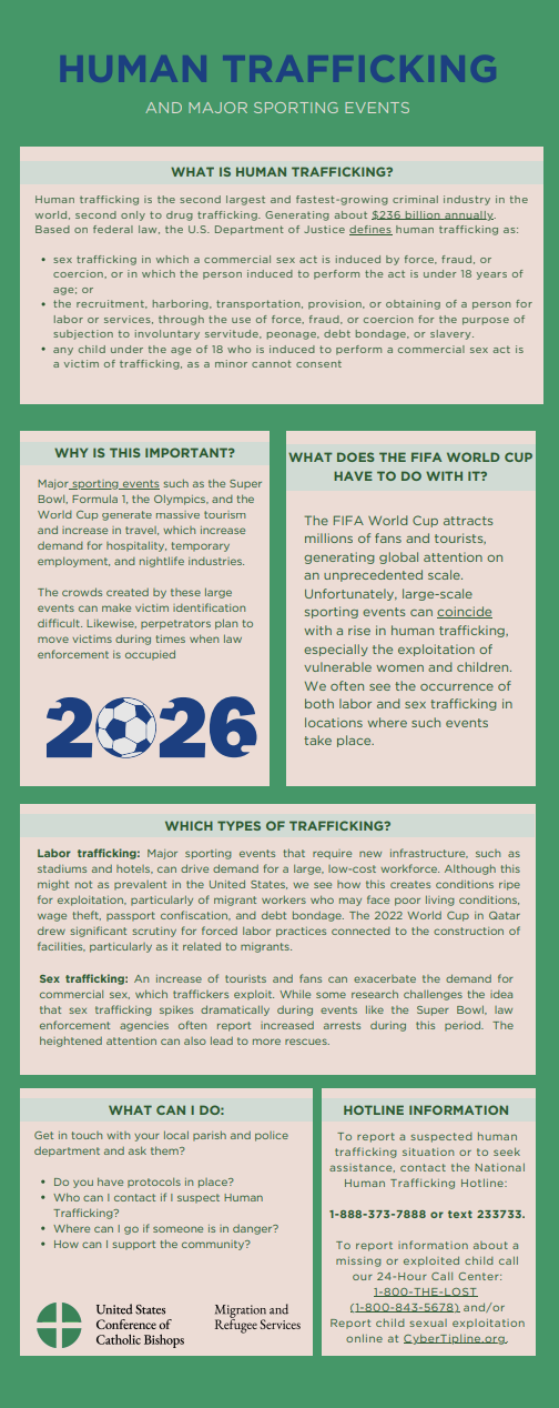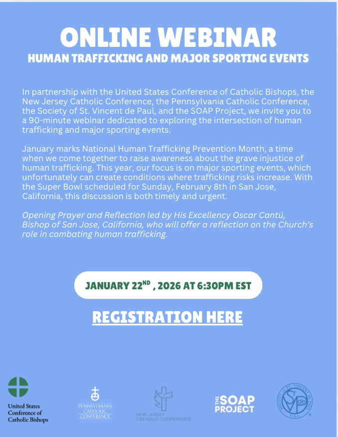 In partnership with the United States Conference of Catholic Bishops, the New Jersey Catholic Conference, the Pennsylvania Catholic Conference, the Society of St. Vincent de Paul, and the SOAP Project, we invite you to a 90-minute webinar dedicated to exploring the intersection of human trafficking and major sporting events.
