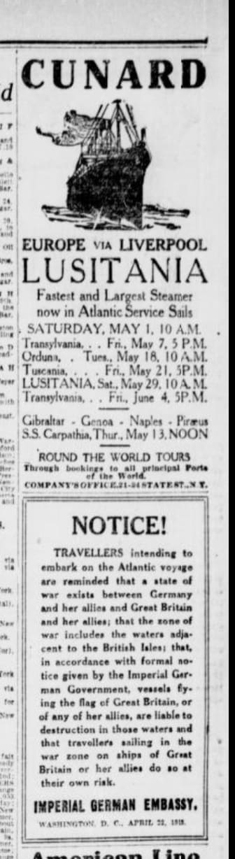 Jon Lovett on One Year of Trump 2.0“And yet with the dreaded danger upon us, I could hardly believe the evidence of my own eyes.”“And yet with the dreaded danger upon us, I could hardly believe the evidence of my own eyes.” Before the Lusitania departed New York City, bound for Liverpool, on May 1, 1915, the German embassy posted notices in the city’s papers warning travelers not to cross the Atlantic aboard vessels flying the British flag. In The New York Tribune, in fact, the warning appeared directly below an ad by Britain’s Cunard for the Lusitania herself, the “Fastest and Largest Steamer” in service. Spooky! And so the possibility of being torpedoed by a German U-boat was never far from passengers’ minds, while also being too horrible to contemplate. The Germans couldn’t sink a world-famous passenger ship filled with civilians, including Americans, could they? Cunard wouldn’t let us sail if we were in such danger, would they? And then… a puff of water in the distance and a streak of white cutting through the ocean like a knife. So what does a worst case scenario feel like?