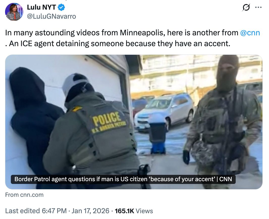 In the video above, an ICE agent stops a man in Minneapolis and says to him: “Talking to you, hearing that you have an accent, I have reason to believe that you are not born of this country” and demands that the man now prove his citizenship on the spot.