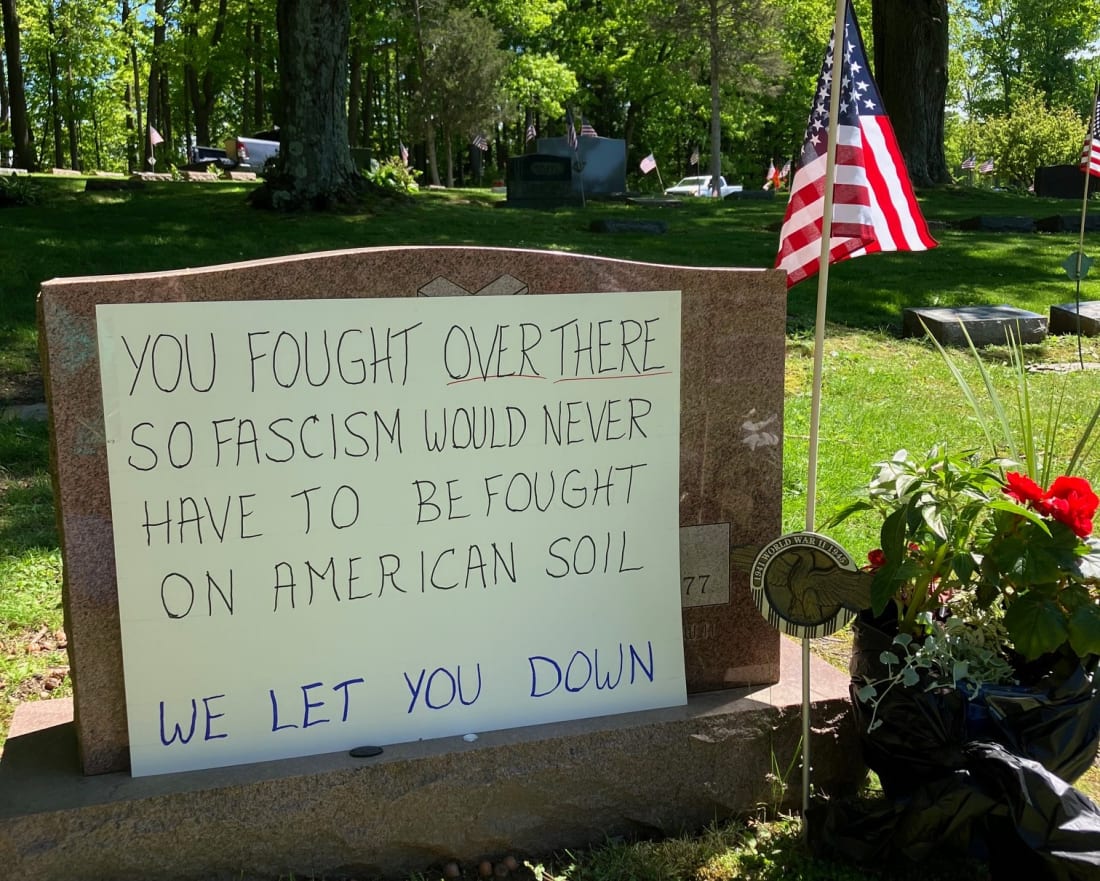 This is my dad’s tombstone last Memorial Day. A few people walked over to quietly tell me that they agreed with me. All our WWII ‘boys and girls’ have been betrayed. They sacrificed so much—many, their lives. My anger is surpassed only by my grief. —Kathy K.