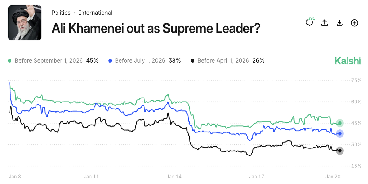Iran’s Supreme Leader Ayatollah Ali Khamenei has ruled for decades, but growing unrest and political pressure are raising new questions about how long he can maintain his grip on power. As headlines shift and signals emerge, Kalshi’s markets reflect new developments in real time, letting you legally trade on whether Khamenei remains in charge or exits sooner than expected.