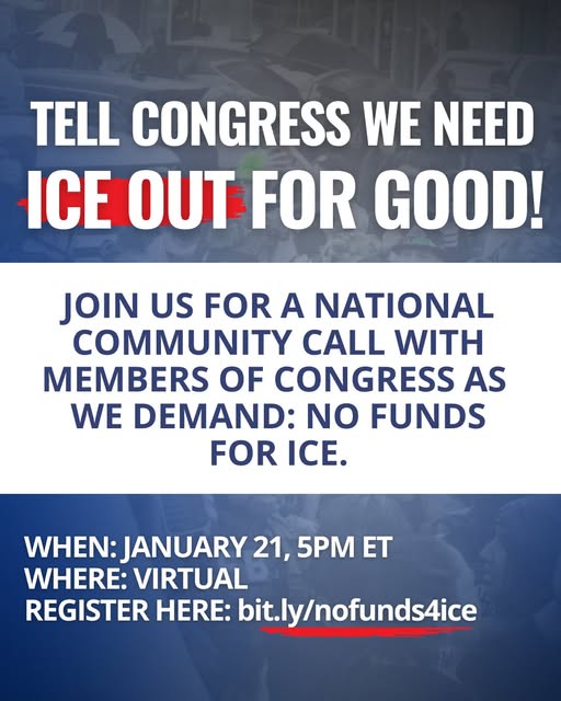 John, Join the national community call TONIGHT with the National Immigrant Justice Center (NIJC), Amnesty International USA, American Civil Liberties Union, National Immigration Law Center, Detention Watch Network, Public Citizen, National Partnership for New Americans, Church World Service, Human Rights First, and the Fair Immigrant Reform Movement to demand Congress cut funding for ICE! Congress will vote THIS WEEK on its fiscal year 2026 bill to fund the Department of Homeland Security (DHS), which would add more funds for the deadly immigration detention and deportation system. As we all remain horrified by the images out of Minnesota and continue to see our immigrant family, friends, and neighbors live in fear, we must come together in community and stand against the cruelty. During the call, we'll talk about how you can take action and tell your members of Congress to stop enabling ICE and Border Patrol’s cruelty and instead invest in our communities. Event Details: Wednesday, January 21, 2026 5:00 PM ET Virtual via Zoom Register now: bit.ly/nofunds4ice Congress already handed DHS a windfall of $170 billion dollars to supersize its deportation force and detention apparatus. Thanks to this blank check, ICE says it already has enough money to detain over 100,000 people at a time and contract 80,000 new beds. 2025 was the deadliest year ever for people in ICE detention, and six people have died in ICE detention just this month. We must demand an end to the violence and terror. |