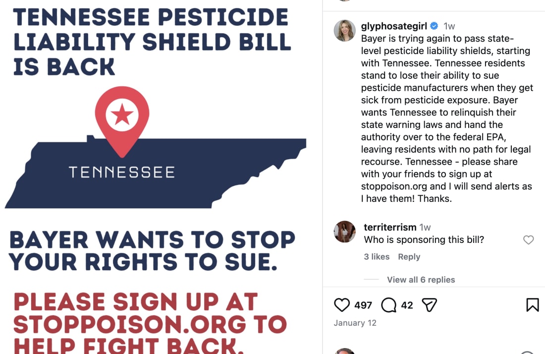 By Adam Garrie The MAHA Report Representatives in the Tennessee House of Representatives will very soon vote on HB 809, a bill that, if passed, would allow such companies as Bayer—the maker of Roundup—to evade all responsibility should its products cause people harm. Today is one of the last opportunities to kill the bill, if enough members of the Tennessee House Judiciary Committee vote against it. Activists say the House is fast-tracking it, sans transparency. Kelly Ryerson, Co-Executive Director of American Regeneration, stated: “HB 809 hands Bayer and other chemical giants a free pass at the exact moment we should be demanding more transparency and greater accountability. This Bill tells farmers, groundskeepers, and families harmed by pesticides that their pain or death is just the cost of doing business, and that is morally indefensible.” Multiple groups, including the non-profit Stand For Health Freedom, Moms Across America, and American Regeneration, are encouraging Tennesseans to call their state representatives and tell them to kill the bill. Courts across the country have found that Bayer failed to warn customers that exposure to Roundup, the popular herbicide, can cause non-Hodgkin lymphoma (NHL), a deadly blood cancer. HB 809 would protect all pesticide and herbicide makers—including Bayer, which is not based in the United States—from legal accountability by providing them with an extremely broad liability shield. Apart from vaccine makers, few other companies enjoy such protections from our justice system. If the bill is passed by the Tennessee legislature and then signed by the governor, even the U.S. Supreme Court’s expected ruling—which will decide whether or not Bayer must comply with state regulations that would force the company to warn of the dangers of Roundup—will not have any positive effect on Tennesseans. Dr. Alexandra Muñoz, a leading toxicologist, said, “This bill is not just about glyphosate: it applies to over 57,000 pesticide products and all future pesticides, including chemicals linked to cancer, Parkinson’s disease, endocrine disruption, infertility, and impaired sexual development.” Dr. Muñoz added, “This industry already knowingly sells carcinogens without cancer warnings. What will they sell when no one can hold them accountable?” Thank you for subscribing to The MAHA Report You can follow us at: TheMAHA_Report on X You can also follow us at: MAHA Action on Facebook Make America Healthy Again™ and MAHA™ are trademarks owned by MAHA TM LLC |