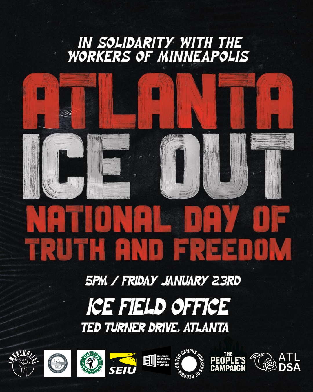 This Friday, Atlanta is mobilizing against ICE violence. When ICE comes for one of us, they answer to all of us. This Friday at 5pm, Atlanta DSA is joining a coalition of local labor and civil rights organizations for a peaceful protest against ICE's murder of Renee Good and the ongoing occupation of Minneapolis. Can you join us?