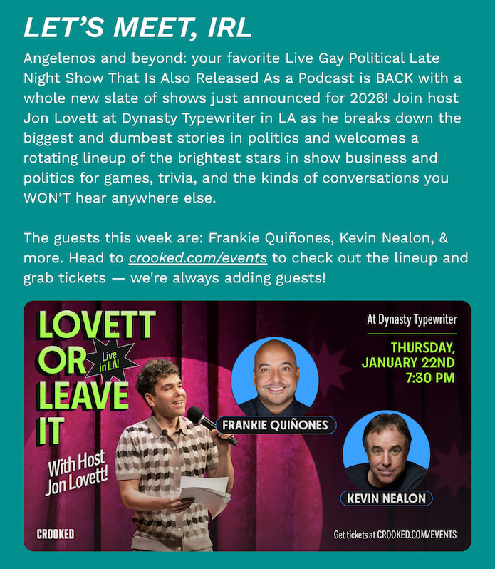 Trump talks a big game about countering China’s global reach. His own unhinged rhetoric, however, is bolstering Beijing. WHAT ELSE? 👀Minneapolis and St. Paul law enforcement are raising concerns about ICE potentially violating citizens’ civil rights — after agents mistakenly targeted off-duty police officers. In one recent instance, agents boxed in an officer’s car and demanded paperwork, according to a local police chief. The agents knocked the phone from the officer’s hand when she tried filming, and the agents fled when she told them she was a cop, the chief said. Each off-duty officer targeted by ICE has been a person of color, he added. Israeli forces killed 11 Palestinians, including two children and three journalists, in the Gaza Strip today, according to local health officials. How’s that ceasefire going, again? The GOP-controlled House Oversight Committee voted to advance resolutions to hold Bill and Hillary Clinton in contempt of Congress for skipping depositions about deceased child sex predator Jeffrey Epstein. Several House Democrats voted with Republicans. The vote could potentially lead to the Department of Justice charging the Clintons, which is what happened to longtime Trump allies Peter Navarro and Steve Bannon. DOGE accessed Social Security information without agency officials’ knowledge, the Trump administration admitted in court for the first time. The agency has “discovered a secret agreement between a DOGE employee and an unidentified political advocacy group,” the Washington Post writes. I guess we were right to freak out about teens running amok in the government systems! A massive winter storm is expected to stretch across 2,000 miles of the United States, from the Southwest to the East Coast, starting Friday. Get ready for power outages, hazardous travel conditions, and frigid temperatures if you live along the path. I, for one, am going to stock up on hot cocoa and blankets ASAP. On that note, kudos to the Austin American-Statesman for this lede: “Ahead of an Arctic blast forecast to bring plunging temperatures … some Texans are asking a familiar question: Where is Sen. Ted Cruz?” That’s because Cruz was recently seen on a flight headed to Laguna Beach, California. But he isn’t trying to escape the cold this time, apparently! “He will be back in Texas before the storm is projected to hit,” a spokesperson said in a statement. Okay, right! Tanned, rested and ready to start shoveling out his neighbors, yeah? LIGHT AT THE END… ☀️The Supreme Court appeared likely to rule against Donald Trump’s firing of Federal Reserve governor Lisa Cook. If Trump loses the case, it would be a major blow to his attempts to seize control of the country’s central bank. Lindsey Halligan, Trump’s hand-picked U.S. attorney tasked with prosecuting former FBI Director James Comey, finally stepped down. It’s a huge blow to Trump’s case against Comey, after two judges separately disqualified Halligan from the job. Thousands of Americans took to the streets to protest Trump’s first year in office yesterday, as polls show that he’s incredibly unpopular. You’ve heard of Dry January. But many young Americans are participating in another version of the trend: No Buy January. The idea isn’t to buy nothing; participants simply try to avoid spending money on nonessential things, like clothes and electronics, that can add up. Speaking of nonessential spending, it feels like every influencer is trying some experimental anti-aging product these days. I mean, just look at whatever tech mogul Bryan Johnson is doing. But one Harvard brain expert offered six tips to stay young: sleep well, minimize chronic stress, hang out with friends, exercise regularly, learn new things, and eat healthily. Yeah… I’d rather do this than follow in Johnson’s footsteps. NASA is letting people sign up to have their names added to the SD card on the Orion spacecraft, which is expected to orbit the moon in the coming years. Here’s the sign up form! A father from Maryland and his 8-year-old daughter earned a Grammy nomination for best children’s album. “It’s so much cooler that it happened in this way,” said the dad, a longtime musician and music teacher. They are adorable. You’re currently a free subscriber to Crooked Media. For the full experience, upgrade your subscription. |