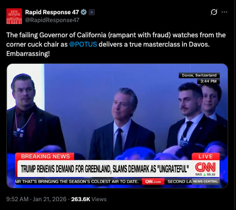 California Gov. Gavin Newsom taunted President Trump’s Davos speech as “boring” and “insignificant,” declaring the Greenland invasion threat “never real,” while the White House fired back by mocking him for watching from the “cuck chair” as Trump backed off military force but insisted on U.S. control.