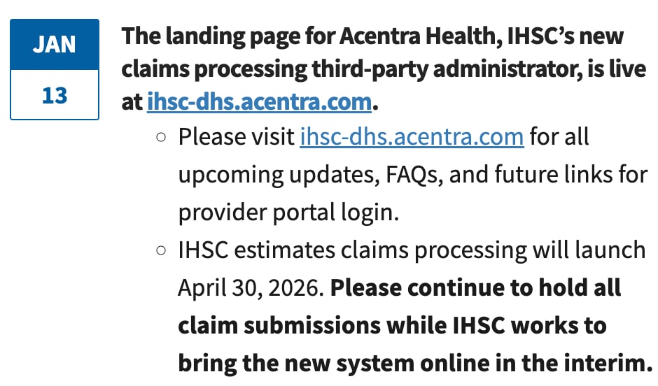 ICE, however, has not paid any third-party providers for medical care for detainees since October 3, 2025. Last week, ICE posted a notice on an obscure government website announcing it will not begin processing such claims until at least April 30, 2026. Until then, medical providers are instructed “to hold all claims submissions.”