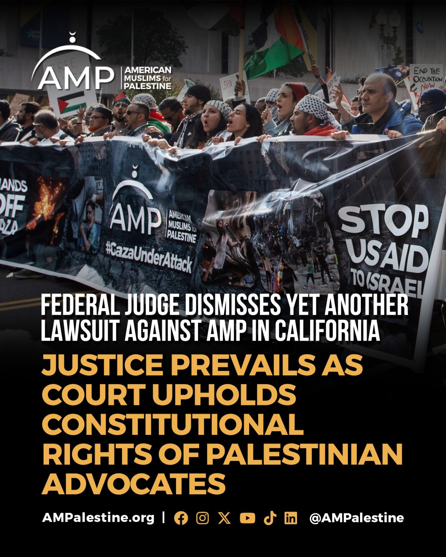 Justice Prevails as Court Upholds Constitutional Rights of Palestinian Advocates Dear Email, In a victory for justice, American Muslims for Palestine (AMP) celebrates the dismissal of yet another case in the Central District of California. Those who stand against free speech can continue attempting to criminalize us for advocating for the truth and educating Americans, but the truth will always prevail. “We are deeply grateful to the Muslim Legal Fund of America (MLFA) and its legal team for their steadfast representation,” said Dr. Osama Abu Irshaid, Executive Director of AMP. “Additionally, we extend our sincere gratitude to Attorney Christina Jump from the Jump Start Legal Justice Center. This victory adds to our long record of legal triumphs. Malicious and hostile lawsuits may find temporary resonance in biased media, but they collapse entirely in the courts. These cases are nothing more than attempts to damage reputations and distract us from our mission.” Judge Mark Scarsi agreed with AMP that the complaint “contains no factual allegations raising an inference that AMP was involved” in any conspiracy to harm the Plaintiffs. The court rejected the attempt to substitute speculation and inflammatory rhetoric for evidence, making it clear that conclusory accusations do not meet even the most basic legal standard. Once again, despite a campaign of baseless claims and deliberate mischaracterizations aimed at smearing our organization and leadership, the facts will win in the end. "I remain incredibly honored to continue representing American Muslims for Palestine in federal courts across the country," said our lead counsel, Christina Jump. "They make my job easy: they tell the truth, and I point out the law. This victory, like the four others we've achieved together before it and even more still to come, proves that courts do read what litigants write, and do care about following the law. Sometimes the road is longer than we want, but when we stick to it, we get there together." This decision makes clear that the courts will not allow themselves to be used as a tool for settling political vendettas. When real evidence and constitutional standards are applied, attempts to dress up propaganda and repression as legal claims fall apart on their own. We will continue to do what we have always done: speak the truth, educate the public, and advocate unapologetically for Palestinian rights and accountability for Israel’s war crimes, genocide, and apartheid. And we will continue to utilize the full extent of the legal system to defeat baseless claims like these and so many others. In solidarity, American Muslims for Palestine (AMP) |