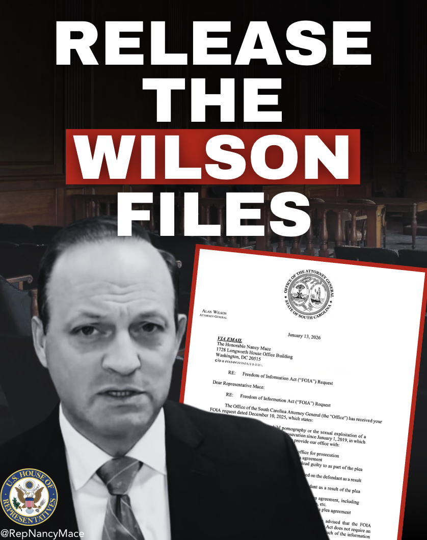 "Those who abuse children should never be free to begin with,” Rep. Mace added. "What happened here is a betrayal of every parent, every victim, and every child in South Carolina. Alan Wilson is turning our state into a pedophile paradise."