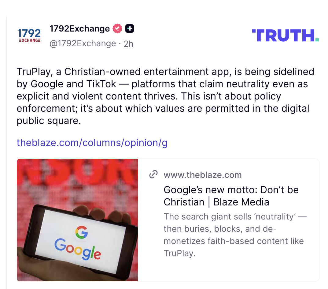 We thought you might take interest in this breaking news story from The Blaze on Google and TikTok's efforts to censor TruPlay, a Christian-owned entertainment app that offers family-friendly, faith-based games and videos for kids. You can read the article here.
