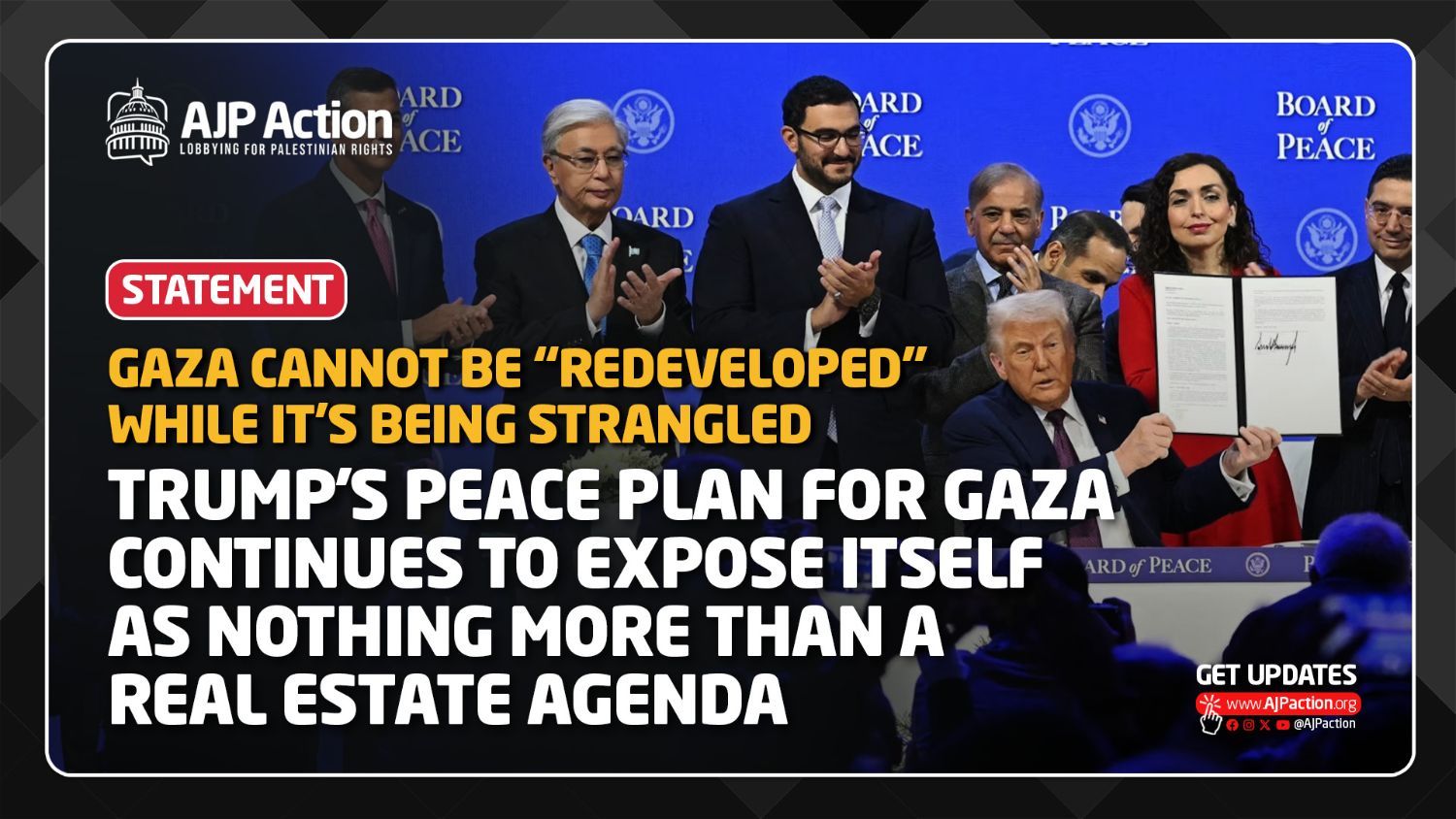 Trump's peace plan for Gaza continues to expose itself as nothing more than a real estate agenda Wednesday’s (January 21st) announcements at the World Economic Forum in Davos, including Jared Kushner’s presentation of a so-called “New Gaza” plan and the creation of a U.S.-backed “Gaza Peace Board,” are deeply dishonest, dangerous, and untethered from realities on the ground. What Kushner presented in Davos, and Trump named a real-estate project, imagines Gaza “rebuilt from scratch,” filled with luxury residential towers, seaside resorts, industrial zones, and tech infrastructure, a vision fundamentally disconnected from reality. It deliberately sidesteps the most basic questions that any legitimate reconstruction process needs to confront: who owns the land being redeveloped; what happens to Palestinians whose homes, neighborhoods, and livelihoods were destroyed; where displaced families are expected to live while rebuilding takes place; and who, if anyone, will guarantee compensation, restitution, and enforceable legal rights for Palestinians, the natives of the land. Most glaringly, the plan proceeds as though reconstruction can occur while Gaza remains under genocide and siege, with Israel continuing to restrict movement, obstruct humanitarian aid, and violate the very ceasefire meant to enable recovery. Rebuilding cannot be achieved while a population continues to be bombed, starved, and displaced. When redevelopment is discussed in the absence of rights, restitution, and Palestinian self-determination, it is not reconstruction. It is dispossession repackaged as investment, a vision that treats Gaza not as a home to millions of people with legal and political rights, but as a blank slate for outside interests once the destruction is deemed “manageable.” This has a name: colonialism. It mirrors the foundational logic of Zionist settler colonialism in Palestine, when the land was falsely framed as empty, underutilized, or lacking legitimate political life to justify its seizure. The only difference here is that this iteration cloaks itself in the language of “peace,” “stability,” and “economic opportunity,” presenting foreign control and imposed restructuring as benevolent intervention. It advances the same colonial premise: that Palestinians are incapable of governing themselves, that their political agency is a threat rather than a right, and that salvation must come from external actors empowered to decide Gaza’s future without its people. Historically, framing domination as rescue has been a core feature of colonial projects. By casting Palestinians as inherently disorderly, violent, or unfit for self-determination, this process attempts to legitimize permanent control, erase Palestinian sovereignty, and normalize the transfer of power, land, and decision-making to outside forces under the guise of peacebuilding. This Davos spectacle, and the broader “peace plan,” is all about such power: who gets to define “peace,” who gets a seat at the table, and which institutions get pushed aside. From the outside looking in, this Board is being created as a new global mechanism, with rhetoric that has gestured toward supplanting UN functions, a posture that reinforces what much of the world already recognizes: the United States repeatedly undermines multilateral accountability when it conflicts with its political agenda, isolating itself further from global consensus and weakening the international system meant to uphold law and protect civilian life. And then there is the most grotesque detail of all: the likes of Netanyahu, a wanted war criminal, being invited to and accepting a seat on a “peace” body tasked with shaping Gaza’s future. The International Criminal Court issued an arrest warrant issued for him on November 21, 2024. Elevating a leader who should be arrested for committing genocide in and destabilizing Gaza into a “peace board” meant to help “stabilize” the same territory is institutionalized impunity. The Board itself is stacked with political actors and private-sector power brokers who have helped launder denial, repression, and the dismantling of accountability into “policy.” Peace is not a brand. Gaza is not a development opportunity. And Palestinians are not an obstacle to be managed while the elites workshop maps and renderings. Trump’s plan continues to expose itself for what it is: a real-estate fantasy and a political project built on denial, impunity, and the attempted erasure of Palestinian rights. Nothing here is signaling an actual path to peace. In solidarity, Americans for Justice in Palestine Action |