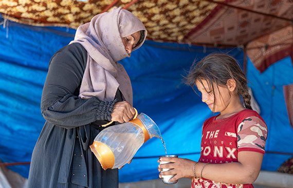 In Syria, Fatima* pours water for her daughter Farah*, provided by Mercy Corps in the displacement camp where they live.