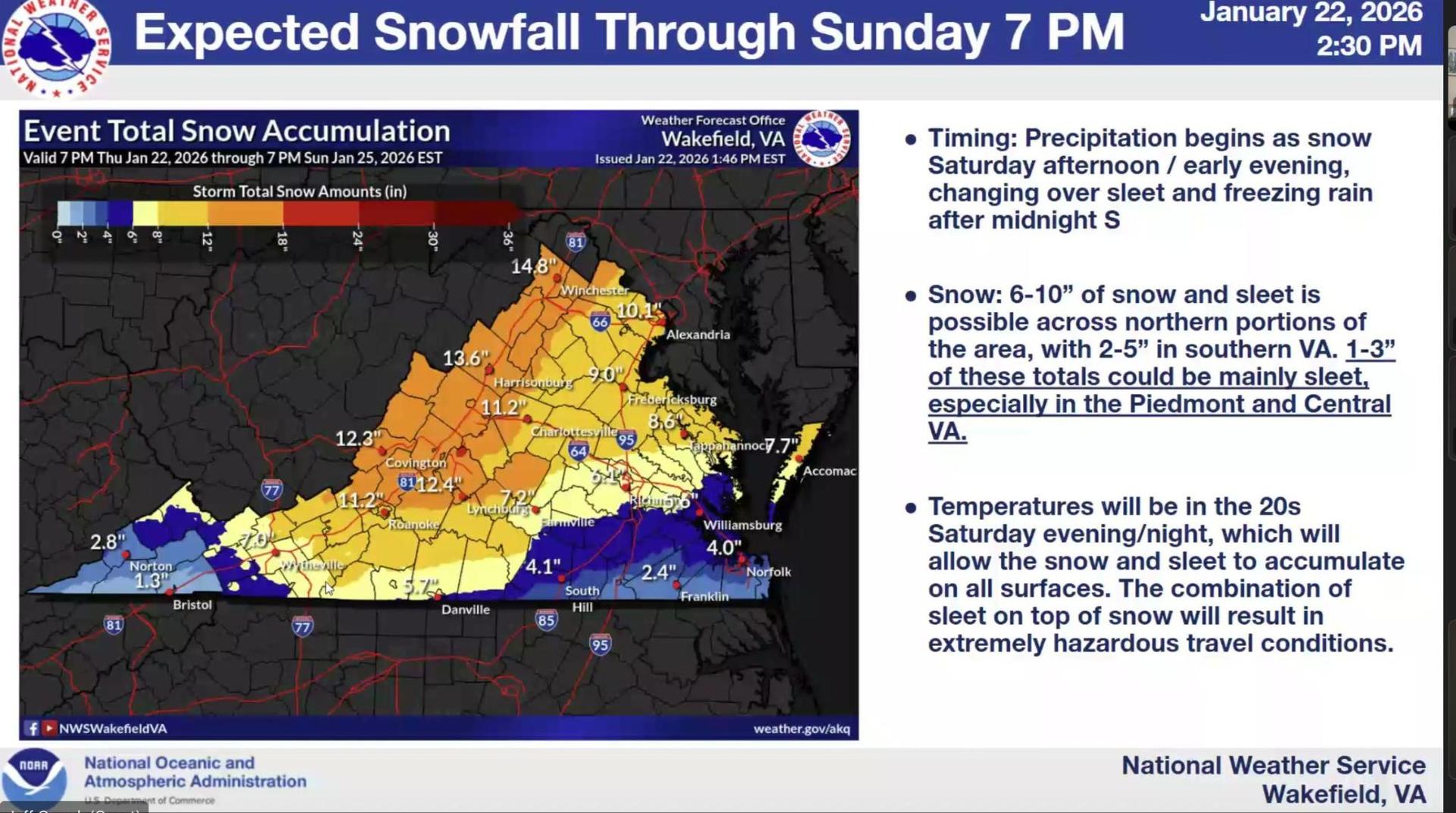 The Virginia Department of Transportation (VDOT) will have all roads treated today, including primary and secondary roadways. They have tree crews that will perform emergency tree debris removal across the state. VDOT says do not travel! Get to where you need to be by 7-8pm on Saturday, January 28th. |