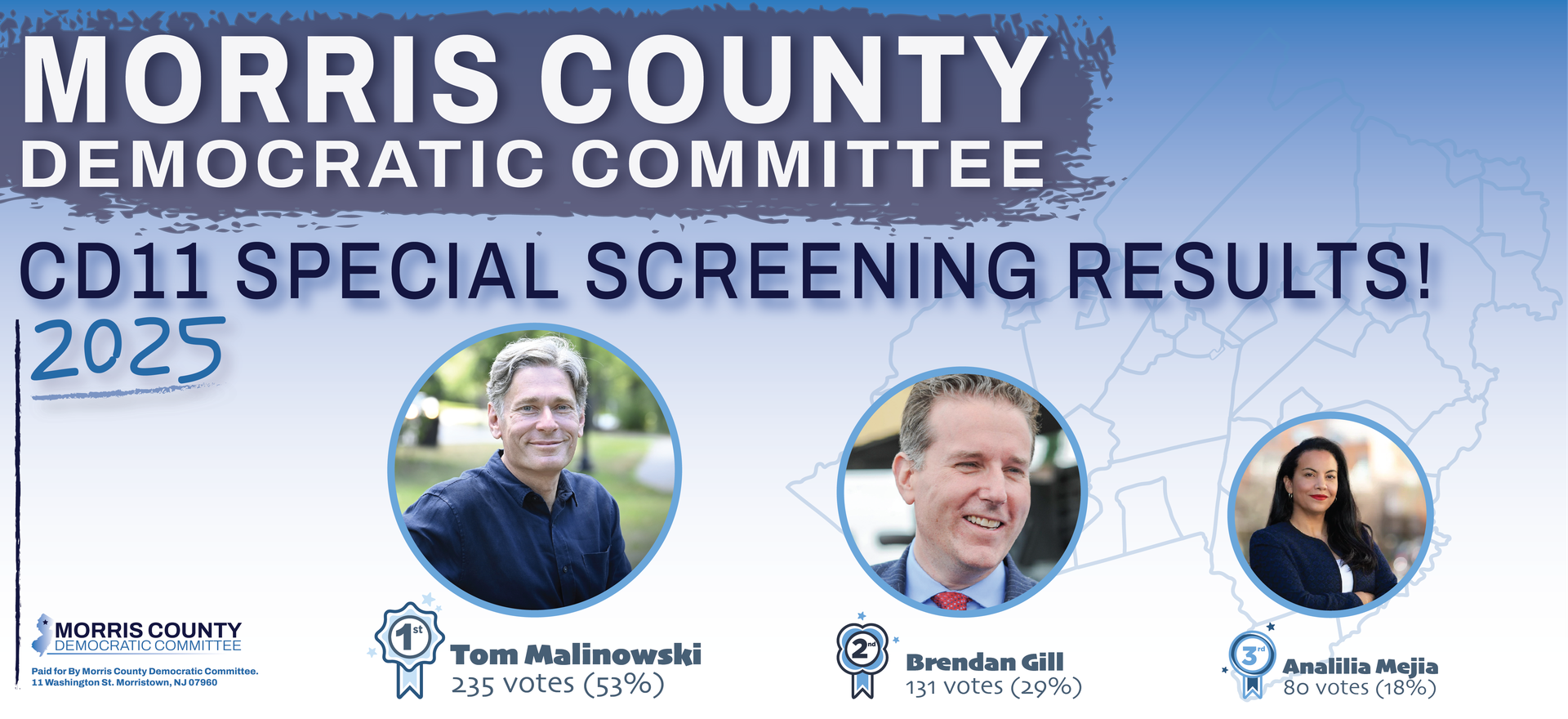 Because of this, on Sunday, December 14, 2025, the Morris County Democratic Committee held a Special Nomination Convention to endorse a candidate for the CD11 special election primary on February 5, 2026. All registered Democrats were welcome to attend, but voting was limited to County Committee members, municipal chairs, Democratic elected officials, state committee members, county E-Board members, and caucus chairs who live in the district.