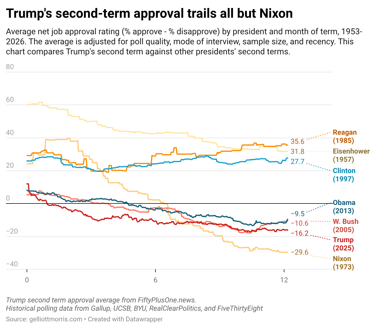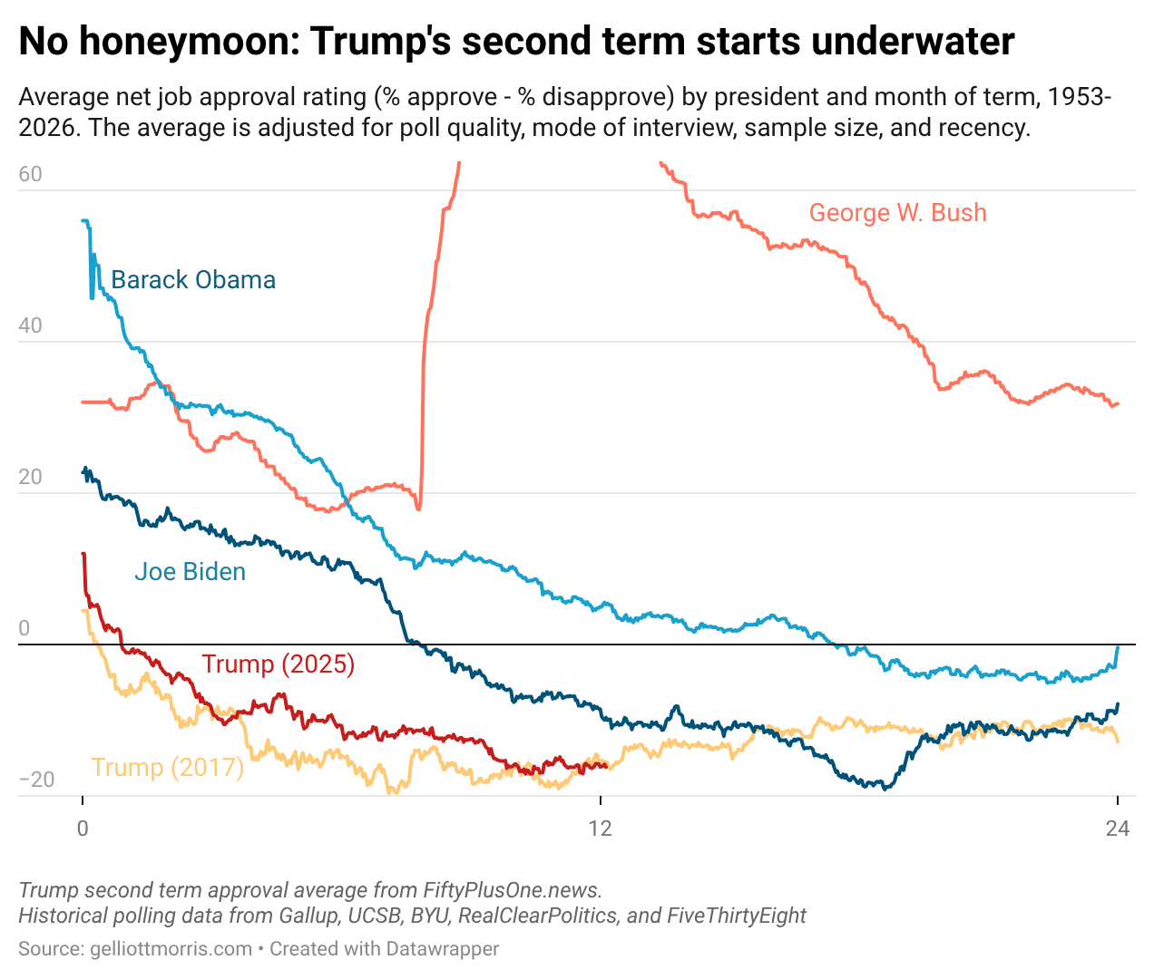 They are no longer willing to give him that chance. Trump sits at an -16 net job approval on average today, down from +5 on his first day in office. His 21-point drop is the worst first-year performance, in the eyes of public opinion, of any president’s first term going back to at least 1948. If you compare the last year to other second-term presidencies, Trump’s is still the worst first-year performance of any president in the modern polling, with one exception: Richard Nixon (who was consumed by Watergate and other national crises at this point in his term).