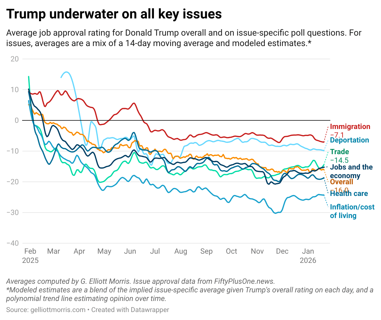 It is really hard to find anything good for Trump in these numbers. The pattern is consistent across every issue: voters asked Trump to lower prices and secure the U.S. border, and instead he’s made prices worse and enacted a much more ambitious deportations agenda than the one sanctioned by voters. Elsewhere, he has ignored voters entirely in order to pursue pet projects that nobody asked for, and to enrich himself at taxpayers’ expense.