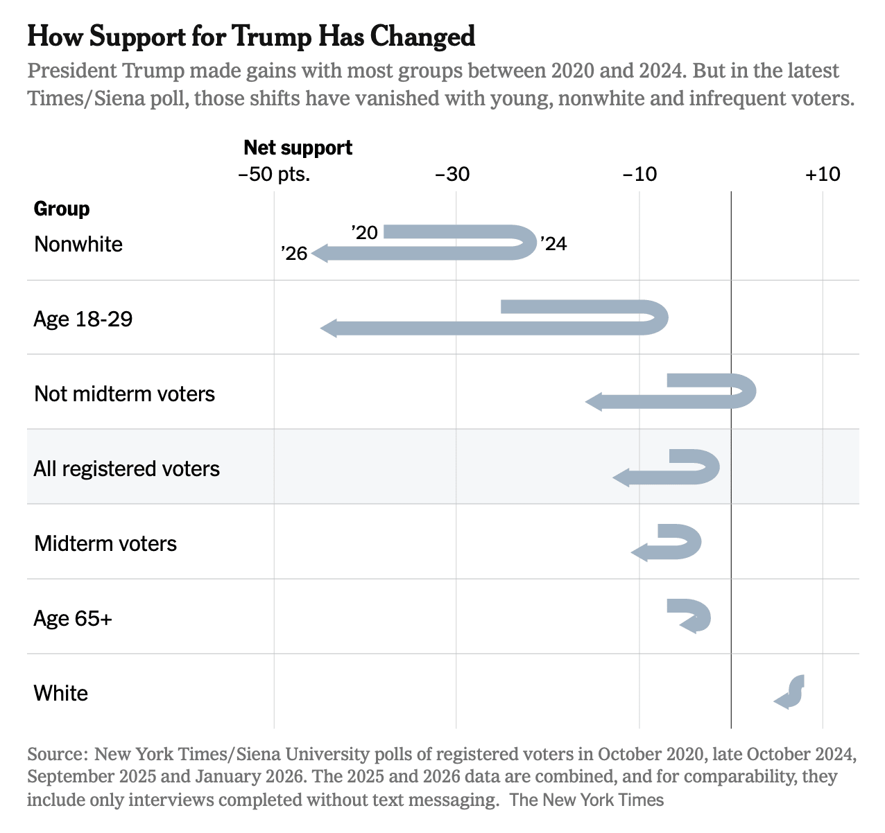 As The New York Times reported this week, Trump’s support among key groups he persuaded to vote for him in 2024 — notably, young, Black, and Latino voters — has now sunk below levels measured in the run-up to the 2020 election (which Trump lost to Joe Biden by 4.5 points in the national popular vote):
