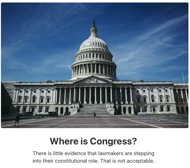 Throughout all of it, one of the most surprising and disappointing things to me has been the lack of action from Congress. Where are the leaders working on legislation to address our country's many issues and to preserve their constitutional authority as one of the three co-equal branches of our government?