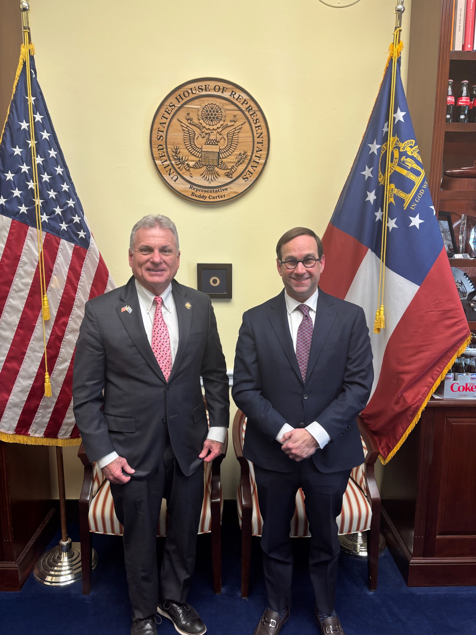 Monday, January 19, 2026: On Saturday, I was in Roberta in Crawford County as I had the honor of addressing the county GOP at their monthly meeting. Roberta is located southwest of Macon in west-central Georgia and is a former railroad hub with a close proximity to the Flint River. Established in 1888 on land for the A&F railroad, Roberta was named after the daughter of a local landowner, Hiram David McCrary. Crawford County was founded in 1822 and named for statesman William H. Crawford. Afterwards, I headed to Forsyth in Monroe County north of Macon, where I met with local officials to discuss the growth the area is experiencing, including the future location of two data centers. Located on I-75 between Macon and Atlanta, Forsyth was founded in 1823 and named for politician John Forsyth and Monroe County was created in 1821 and named for James Monroe. Later in the evening, I was in Suwanee in Gwinnett County where I attended the Republican local candidate forum and was honored to address the group. On Sunday, I attended Christ Covenant Church in the Buckhead community in Atlanta where Senior Pastor Jason Dees did a great job delivering a meaningful and inspirational message. A Christ-centered church on mission to make disciples that make disciples, Christ Covenant has grown significantly and now has a location in Sandy Springs, with typically over 1,800 in attendance, many of them young people. After traveling back home yesterday afternoon, I’m up early this morning and live on Fox Business’ Mornings with Maria as I join guest host Cheryl Casone and we discuss the upcoming budget votes this week and the situation in Minneapolis. After being home less than 16 hours, most of it dark, I head back to Atlanta and then drive to Morganton in Fannin County in the North Georgia Mountains where I am honored to speak to the county GOP at their monthly meeting. Fannin County is located at the tri-state area of Georgia, North Carolina and Tennessee and is near where I went to school at Young Harris College. It was created in 1854 and is named after James Fannin, a veteran who fought in the Texas Revolution. Rep. Carter interviewed on Capitol Hill Tuesday, January 20, 2026: After joining in on our weekly all staff conference call, I head to the Atlanta airport for my return trip to Washington. Once back in our office, I have a series of meetings with our staff beginning with our scheduling team and followed by our communications team. Next, I meet with representatives from Abbvie, a pharmaceutical manufacturer, to discuss healthcare issues before having a call with the CEO of CVS/Caremark who will be testifying before the Energy and Commerce (E&C) Health Subcommittee later this week. Afterwards, I head to the House Visitors Center (HVC) where the House GOP is having a media row to discuss year one of the second Trump Administration. After doing four interviews with various outlets, I head to an E&C member briefing on FirstNet legislation and then head to the members dining room at the Capitol for a meeting with members of the White House Office of Legislative Affairs (OLA). Next, I head to our weekly Whip Team meeting before heading to the House Chamber for our first vote series of the week. After remaining in the Chamber to speak on the Food and Drug Administration (FDA) Modernization Act that I am sponsoring, I head to a meeting of the Republican Main Street Caucus (RMSC) where we hear from one of our colleagues, Rep. Andy Harris (R-MD) who is Chair of the Freedom Caucus. Rep. Carter meets with AbbVie Wednesday, January 21, 2026: After our weekly GOP Conference meeting, I head to the House Chamber where I pay tribute to Wayne Barth from Union County Hospital in Blairsville for being chosen as a 2025 Hospital Hero by the Georgia Hospital Association (GHA), Barbara Harn from Northside Hospital in Cherokee for being awarded the Lifetime Achievement Award given by the GHA, Nurse Heather Daniels from Liberty Regional Medical Center who was also chosen as a 2025 Hospital Hero by the GHA and seven Georgia Golf Courses that were named to Golf Week’s top 200 resort golf courses in America. Next, I head to an E&C full committee markup that lasts most of the day with intervals including a break for our first vote series of the day and one where I meet with Nuspera Medical to discuss Centers for Medicaid and Medicare Services (CMS) policies. After the markup I have a meeting with the CEO of Cigna who also will be testifying before the E&C Health Subcommittee tomorrow. After our second and last vote series of the day, I remain in the Chamber and pay tribute to Seth Nesmith of Atrium Health Navicent in Macon, who was honored by the GHA as a 2025 GA Physician Hero. My last meeting of the day is off Capitol Hill as I meet with the American Nuclear Society (ANS) Nuclear Policy Leadership. Rep. Carter visits with Neuspera Medical Thursday, January 22, 2026: I’m back off Capitol Hill this morning as I attend a bipartisan energy discussion with the American Petroleum Institute (API). Once back on Capitol Hill, I head to the aforementioned E&C Health subcommittee hearing where we hear from Insurance Company executives. This hearing was personal for me as I have practiced Pharmacy for over 40 years and witnessed first-hand the egregious practices of these companies and how they have had a major role in trying to ruin healthcare in our country. Afterwards, I head to the triangle outside the plaza in front of the Capitol where I host a press conference with Voters for Cures on Pharmacy Benefit Manager (PBM) reform. Afterwards, I head to the Capitol where I visit briefly with Paris Hilton who is in town promoting legislation. Paris is a great example of someone using their celebrity status to advocate for causes she believes in. Next, I head to an E&C Environment Subcommittee hearing on the Toxic Substance Control Act (TSCA) before heading to the House Chamber for our final vote series of the week where we pass ou