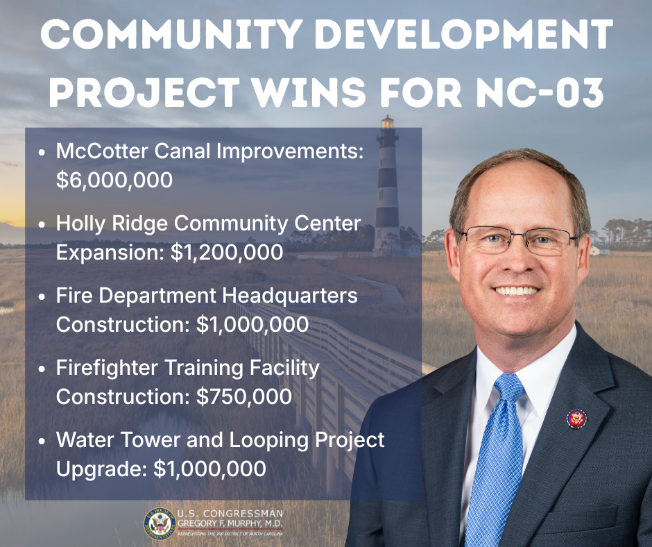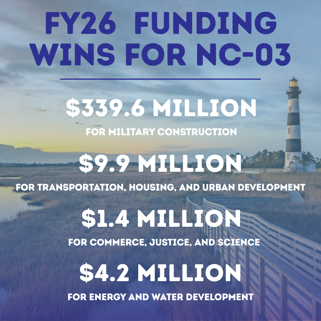 Through the appropriations process, House Republicans continue to deliver results for the American people and for Eastern North Carolina by passing funding that improves the lives of constituents in the Third District. Overall, I am proud to share that I have secured $339.6 million for Military Construction on our Marine bases, $9.9 million in Community Project Funding requests for transportation, housing, and urban development projects, $1.4 million in Community Project Funding requests for commerce, justice, and science projects, and $4.2 million in Community Project Funding requests for energy and water development projects in 2026. That's a lot of great wins for Eastern North Carolina!