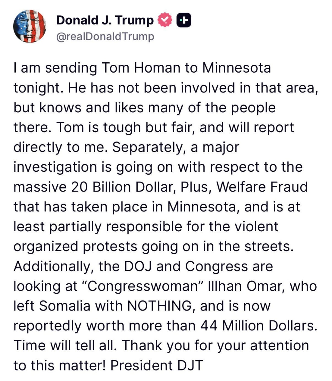 Trump announces investigations into $20B fraud and Rep. Ilhan Omar: Trump wrote on Truth Social that “a major investigation is going on with respect to the massive 20 Billion Dollar, Plus, Welfare Fraud that has taken place in Minnesota” and that “the DOJ and Congress are looking at ‘Congresswoman’ Ilhan Omar, who left Somalia with NOTHING, and is now reportedly worth more than 44 Million Dollars.”