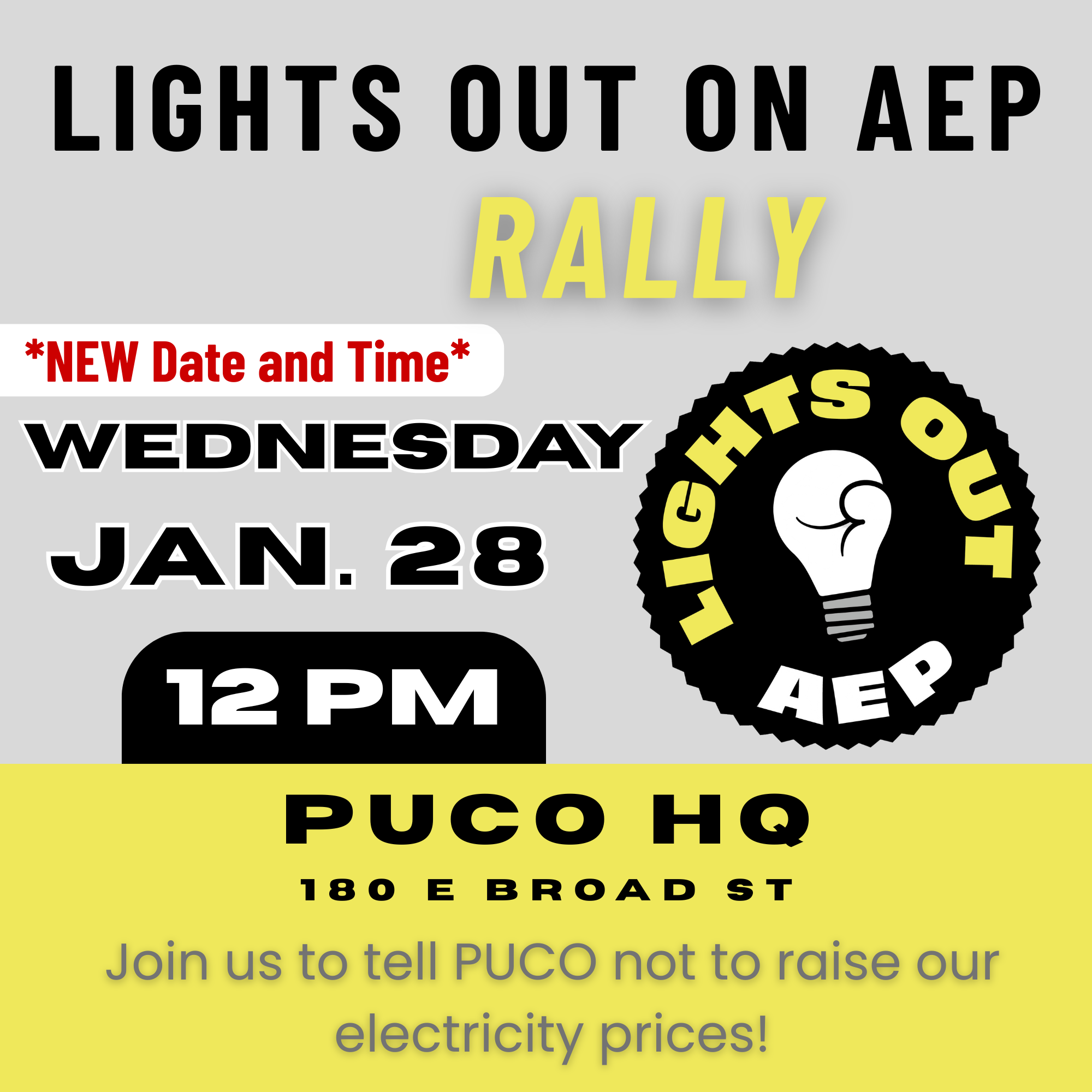 The Lights Out on AEP Rally has been postponed to WEDNESDAY, January 28, at noon due to inclement weather. Continue to share the rally invite and bring your neighbors.