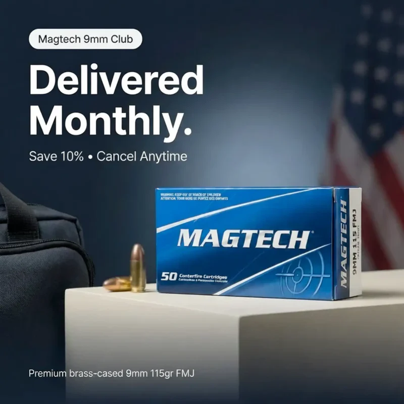 The 9mm Ammo Club locks in your supply—150, 200, or 250 rounds delivered every month. No hunting. No price spikes. Cancel anytime.