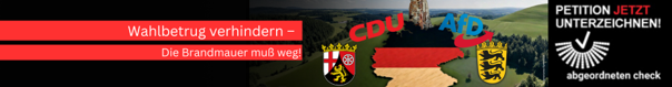 über Deutschland geht wirtschaftlich keine Sonne auf. Viele Branchen leiden unter schlechter Konjunktur und verfehlter Politik von Schwarz-Rot. Gasspeicher leeren sich, Deindustrialisierung schreitet voran, die Energiewende bleibt aus. Doch mit den kommenden Wahlen in Baden-Württemberg und Rheinland-Pfalz haben wir die Chance, der Merz-Regierung einen Denkzettel zu verpassen. Wenn dort die Brandmauer fällt, wird sich das auch die Koalition im Bund auswirken. Versenden Sie deshalb unsere Petition an die Landtagsabgeordneten und üben Sie so Druck auf sie aus, denn jede Koalition, die nicht Schwarz-Blau ist, ist mit Wahlbetrug gleichzusetzen.