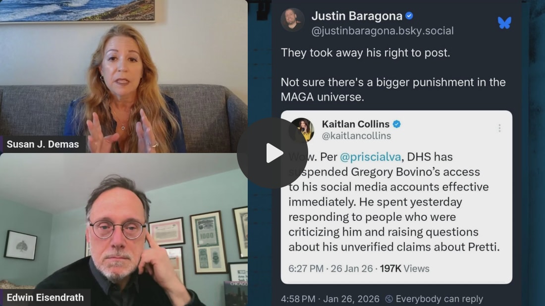 Enjoy 25% off our annual subscription rate and get all-access to analysis and commentary from our expert strategists when you upgrade right now. Tear down those paywalls and get all-access to Lincoln Square while making a direct investment in defending democracy. Bye-Bye Bovino | Edwin Eisendrath & Susan Demas LIVETrump and MAGA are In a tactical retreat thanks to Minnesotans saying, ENOUGH.In a win for the people of Minnesota, the Trump Administration announced that Greg Bovino, the commander-at-large for Customs and Border Protection, is being reassigned to his previous position of commander in El Centro, California. Some media are reporting that he’ll be retiring soon. And in a fate worse than death for Trump officials, they’ve reportedly cut off Bovino’s official social media access. Susan J. Demas and Edwin Eisendrath recapped the last few days in the wake of the murder of Alex Pretti, a VA nurse from Minneapolis, that led up to Bovino’s humiliation. “America isn’t the country they keep telling us we are. That we are actually a place that is decent and that we love our freedom and that the idea that federal thugs can walk into city streets and shoot people with impunity is simply not acceptable,” Edwin said. And while this is a hard-fought victory for those standing up to ICE, we can’t rest until Kristi Noem, Stephen Miller, and Donald Trump himself are out of power. It’s up to Democratic leaders in Congress to stay strong and refuse to spend another penny on ICE and DHS — the brave people of Minneapolis deserve no less. Check out more from Susan and Edwin right here on Lincoln Square. Not ready to subscribe? Make a one-time donation of $10 or more to support our work amplifying the facts on social media, targeted to voters in red states and districts that we can help flip. Every $10 reaches 1000 Americans. The Truth needs a voice. Your donation will help us amplify it. |
