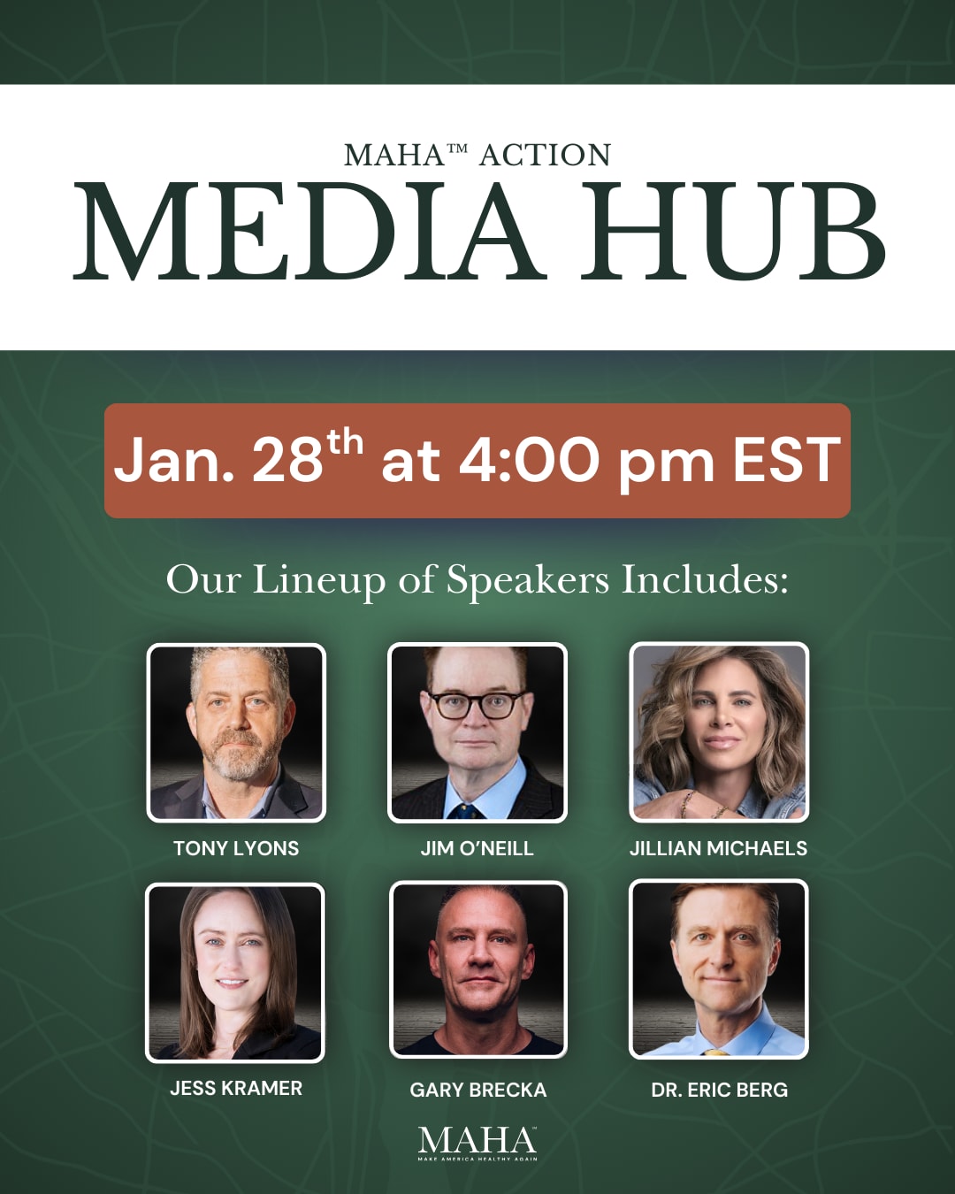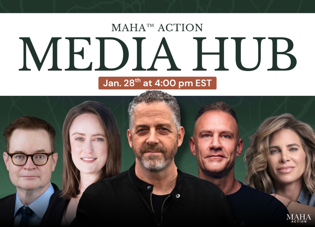 Please join us on Wednesday, January 28, from 4pm - 5pm Eastern, for the MAHA Action Media Hub, featuring some of the top thought leaders of the MAHA movement. The event will explore what MAHA is doing for millions of Americans and what all Americans can do to strengthen MAHA’s reach. The program features MAHA Action president and host, Tony Lyons; human biologist, biohacker, and longevity expert, Gary Brecka; globally recognized health educator and author, Dr. Eric Berg; HHS Secretary Kennedy’s Deputy Chief of Staff and Special Counselor, Stefanie Spear; President Trump’s pick for Assistant Administrator of the EPA’s Office of Water, Jess Kramer; author, speaker, and philosopher, Charles Eisenstein; Deputy Secretary of Health and Human Services and acting director of the CDC, Jim O’Neill; cellular health expert and author, Dr. Daniel Pompa; and fitness trainer, author, and host of the Keeping It Real podcast, Jillian Michaels. To attend our media hub, simply click the free registration link here. All of our Media Hub events are open to the public and the press. We hope to see you Weds@4pm!! Thank you for subscribing to The MAHA Report You can follow us at: TheMAHA_Report on X You can also follow us at: MAHA Action on Facebook Make America Healthy Again™ and MAHA™ are trademarks owned by MAHA TM LLC |