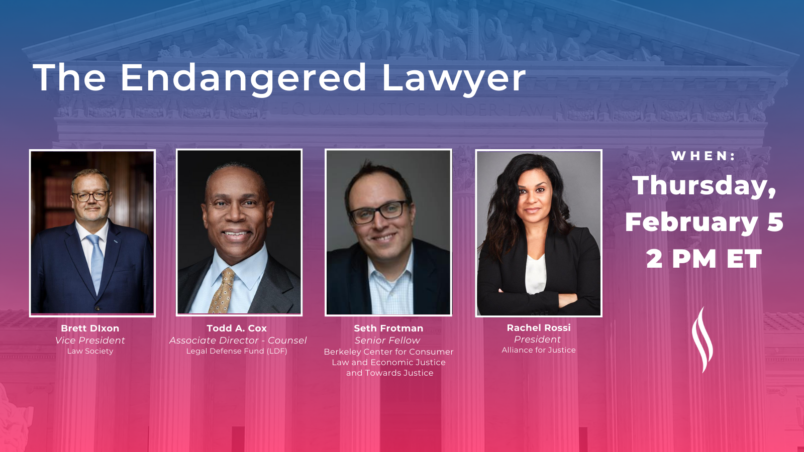 We are excited to invite you to an important discussion, Holding Court: The Endangered Lawyer, taking place on Thursday, February 5, 2026, at 2 PM ET. Join us for a conversation with Brett Dixon, Vice President of the Law Society; Todd A. Cox, Associate Director-Counsel of the Legal Defense Fund (LDF); and Seth Frotman, Senior Fellow at the Berkeley Center for Consumer Law and Economic Justice and Towards Justice. AFJ President Rachel Rossi will be moderating the discussion.