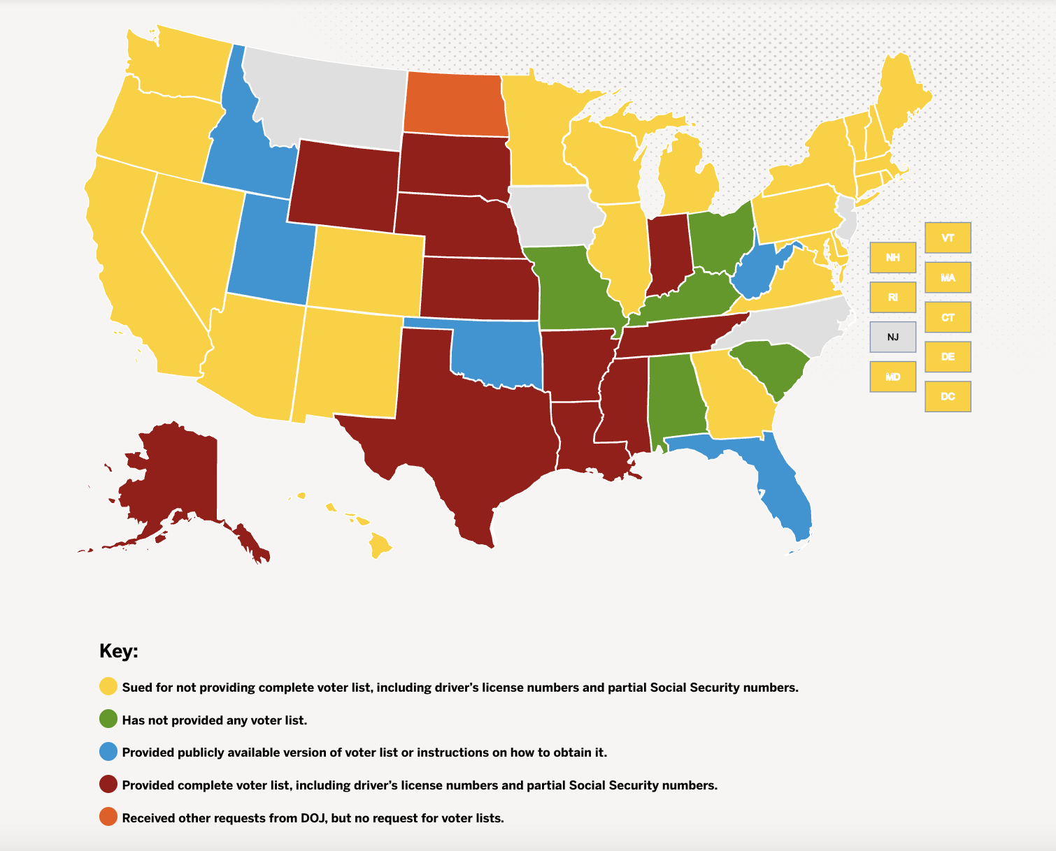 In fact, 44 states including Washington, D.C. have received similar requests for their voter rolls. Take a look at this map for yourself: