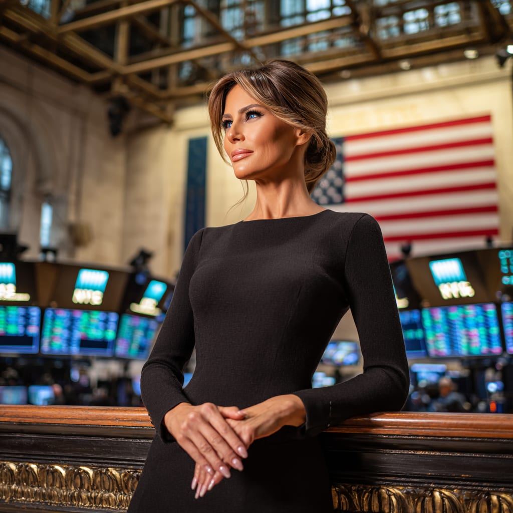Symbolic Bell Ringing : Melania, in a sleek black dress, pressed the button amid cheers from traders and received a custom engraved commemorative plate from NYSE President Lynn Martin—a first for the exchange.