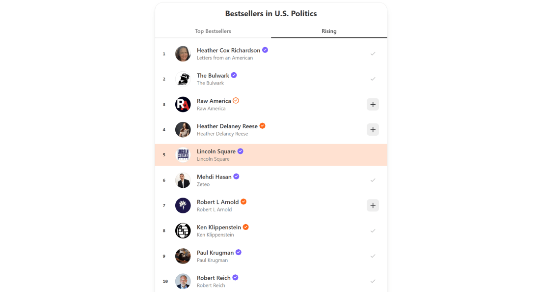 Dear Friend, Thank you for being an active, free subscriber. By subscribing, you’ve helped Lincoln Square become one of the fastest-growing pro-democracy communities on Substack! …and a huge thanks to our paid subscribers (the Lincoln Loyal) for propelling Lincoln Square to the #5 spot on Substack’s Rising Best Sellers chart—That’s over 100 times in the Substack Top 10 since our launch last March! We are beyond honored that our paid members have elevated us to become one of the most respected and popular political voices on the platform. Just take a look at today’s rankings: When you upgrade your free subscription or donate to Lincoln Square, you make our independent analysis and expert commentary possible. As we grow, we’re introducing a new chapter. We’re hard at work adding new content and expert contributors in the coming weeks, including a new streaming show, “Need to Know” with former FBI Assistant Director and MSNOW analyst, Frank Figliuzzi, For 25 years at the FBI, Frank Figliuzzi sat behind the curtain. Now, he’s pulling it back. Because when the stakes are our democracy, the facts aren’t just headlines—they’re survival. Every week on Lincoln Square Media, Frank will deconstruct the threats, the tactics, and the intelligence you won’t hear anywhere else. This is the analysis you literally can’t afford to miss. Upgrade now so you don’t miss this show! To fuel this growth and ensure we can continue to deliver the high-caliber commentary you’ve come to expect, some of our most sought-after features will now be exclusively available to our valued paid subscribers. By upgrading, you directly empower Lincoln Square to bring you even more engaging content from the sharpest minds across the political spectrum. It’s a direct investment in the future of informed discourse and a deeper connection with the community driving it. Ready to unlock the full Lincoln Square experience? Access 35% off today your paid subscription—that’s just 18 cents per day! This offer ends at Midnight, TONIGHT! You can cancel at any time. If that hasn’t convinced you, consider this: Your paid subscription fuels the growing movement against authoritarianism. At Lincoln Square, your subscription isn’t a transaction—it’s an investment in the truth. Our content has hit 500 million impressions to over 100 million Americans because we deliver the critical facts voters need to stand firm. One subscription reaches 1,000 fellow citizens. For a mere 18 cents a day, you become a catalyst for an informed America. The clock is ticking: This exclusive offer to join the movement ends at midnight TONIGHT. Help fortify our democracy for just $6.50/month or $65/year. You can cancel at any time. Your All-Access PassWhen you upgrade to a paid subscription, you aren’t just watching—you’re getting the strategic blueprint to save our Republic.